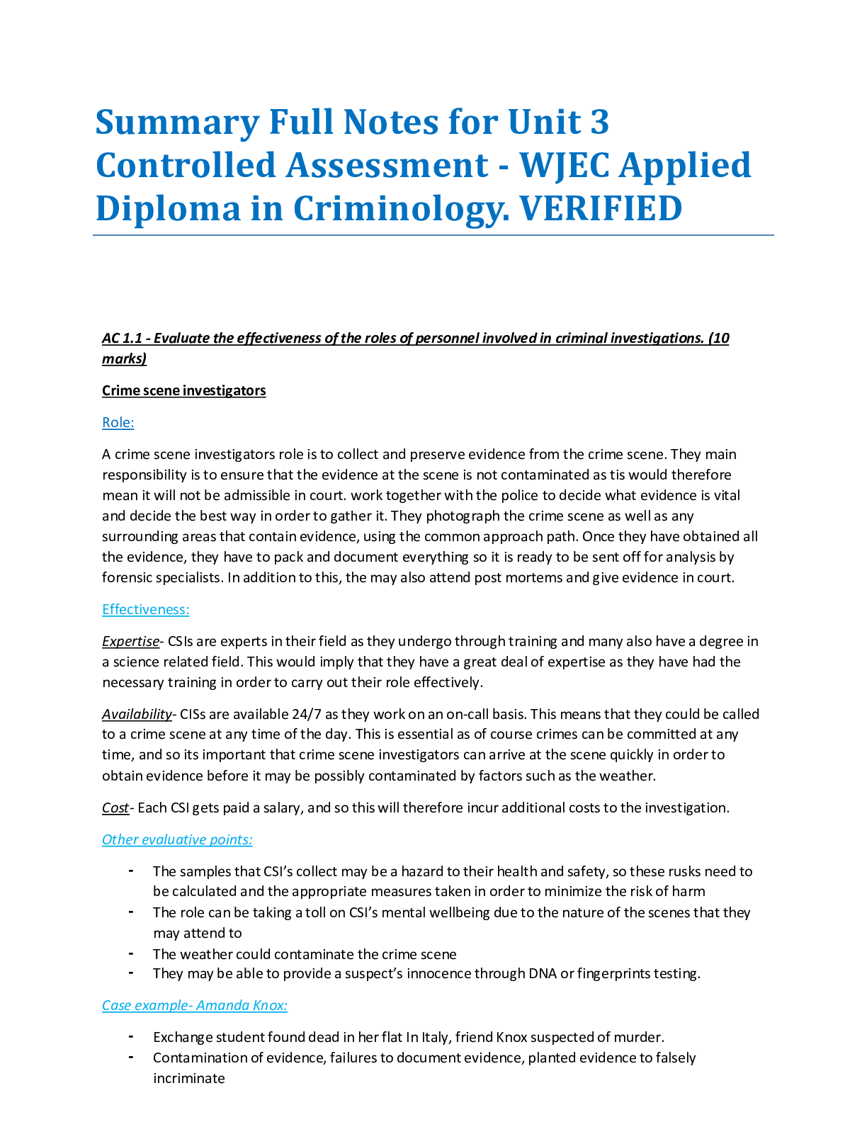 Criminology > Summary > Summary Full Notes for Unit 3 Controlled Assessment - WJEC Applied Diploma in Criminology. VERIFIED