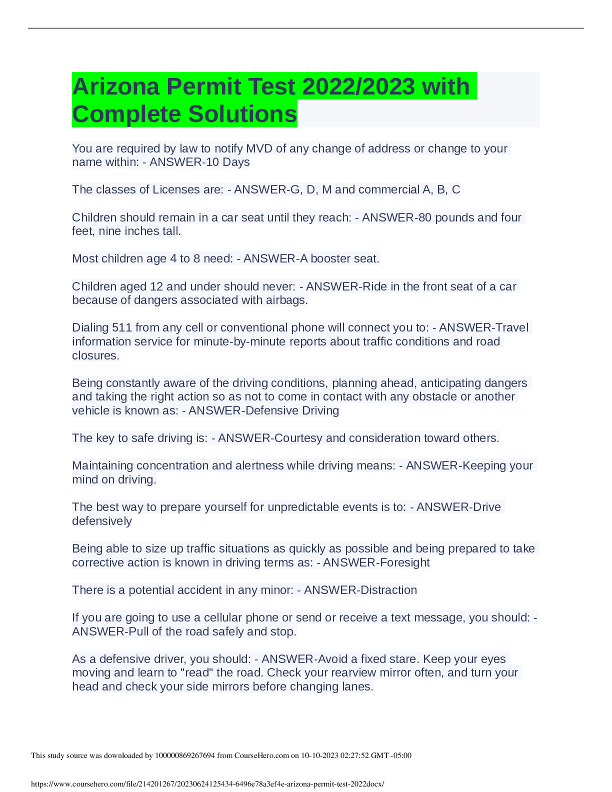 *NURSING > EXAM PROCTORED > Arizona Permit Test 20222023 withComplete Solutions