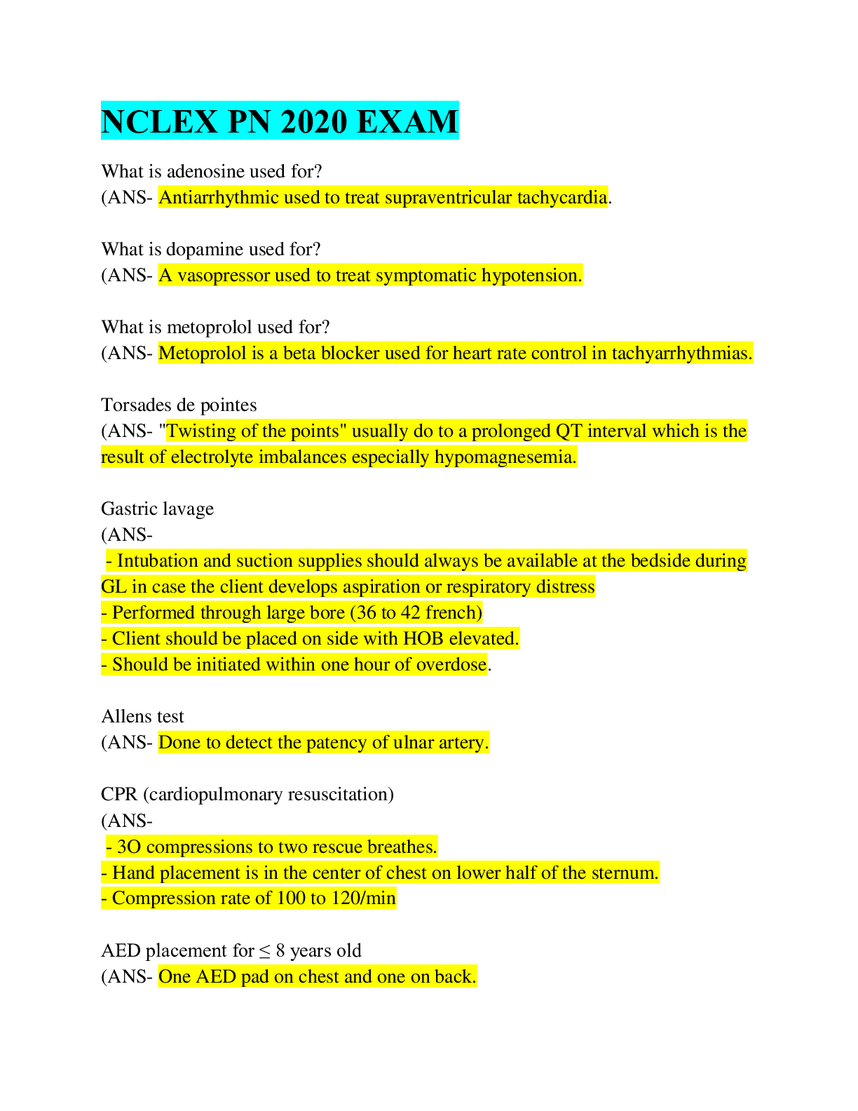 Health Care > NCLEX-PN > NCLEX PN 2020 EXAM(Latest update) Questions& Answers