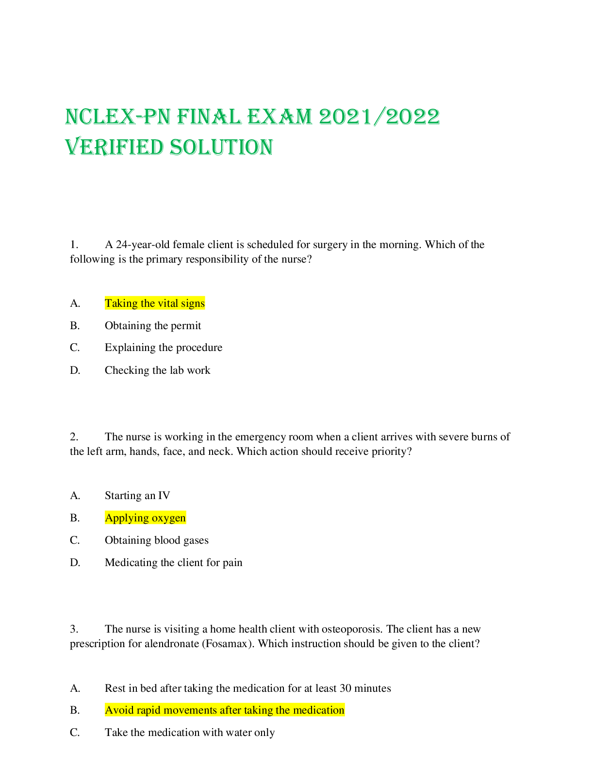 Health Care > NCLEX-PN > NCLEX-PN FINAL EXAM 2021/2022 VERIFIED SOLUTION