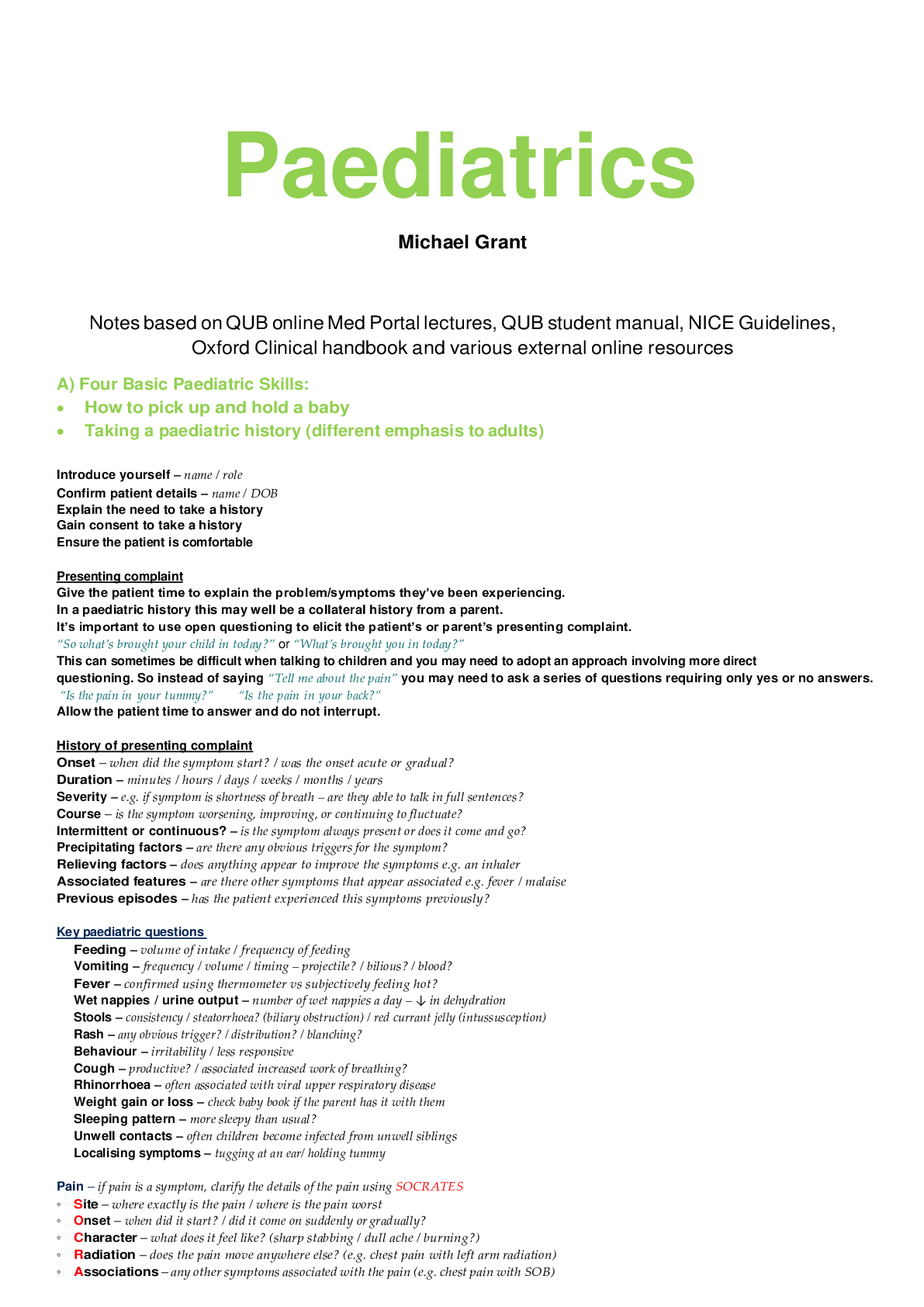 *NURSING > NCLEX-PN > Paediatrics Michael Grant: Notes based on QUB online Med Portal lectures, QUB student manual, NICE Guidelines, Oxford Clinical handbook and various external online resources