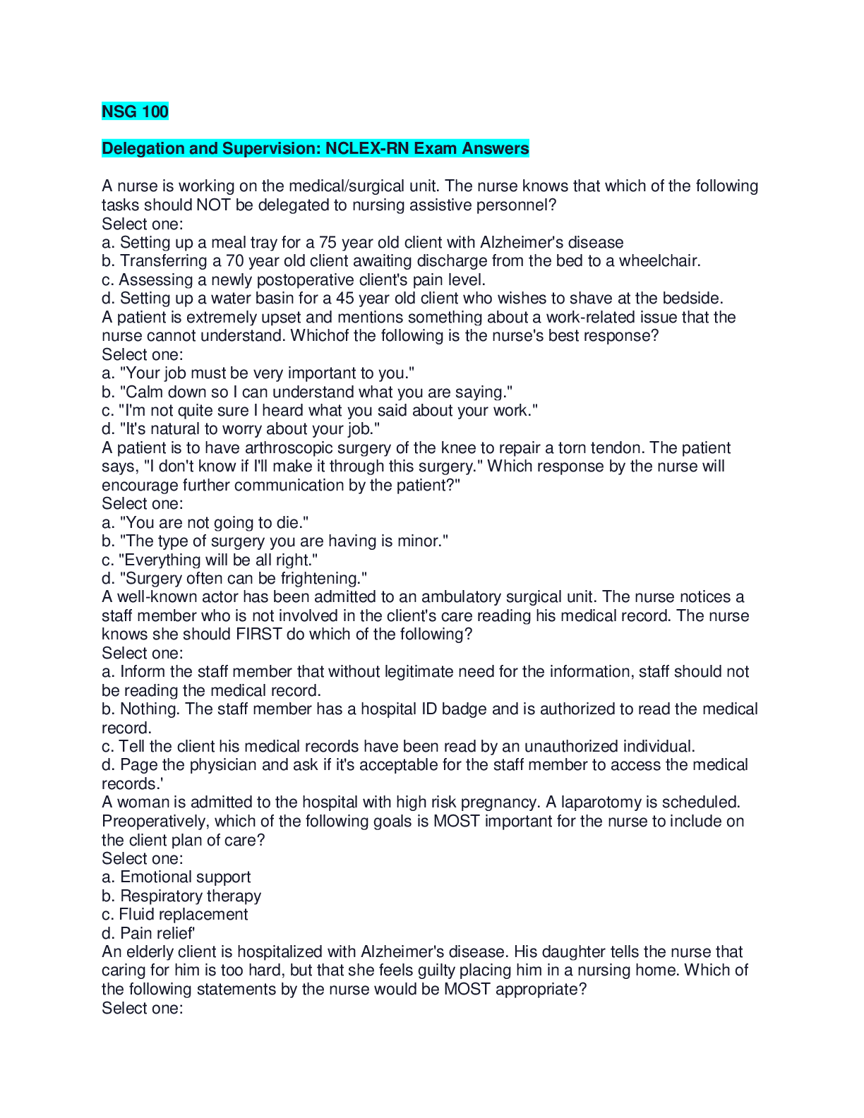 Health Care > NCLEX-RN > NSG 100 Delegation and Supervision: NCLEX-RN Exam Answers