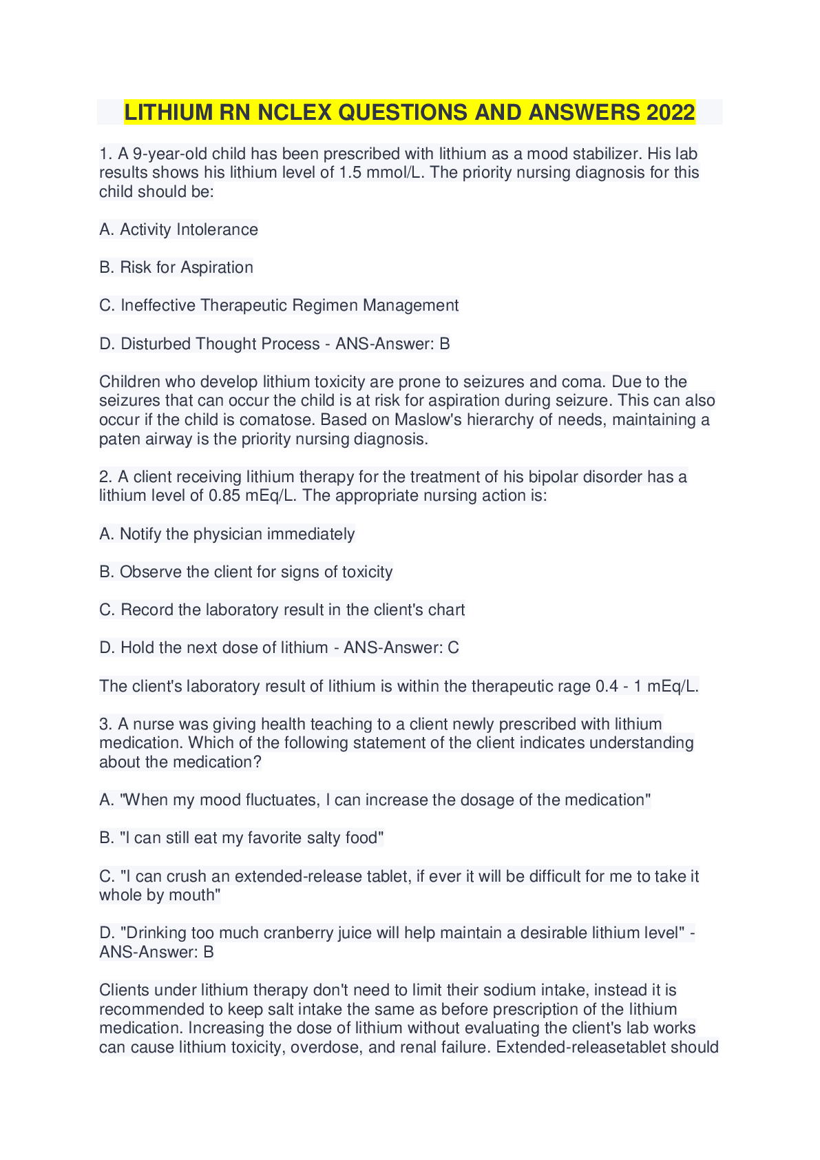 *NURSING > NCLEX-RN > LITHIUM RN NCLEX QUESTIONS AND ANSWERS 2022
