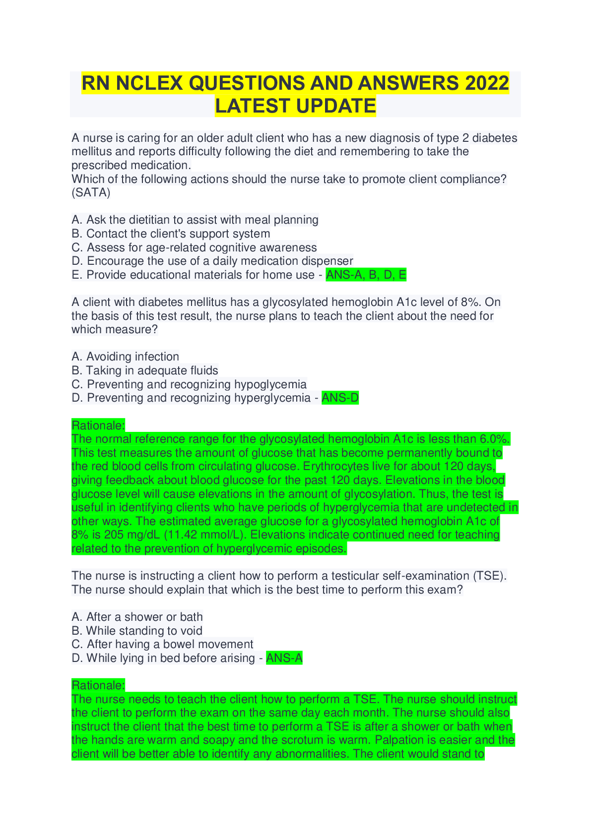 *NURSING > NCLEX-RN > NCLEX-RN PRACTICE QUESTIONS AND ANSWERS WITH RATIONALES 2022