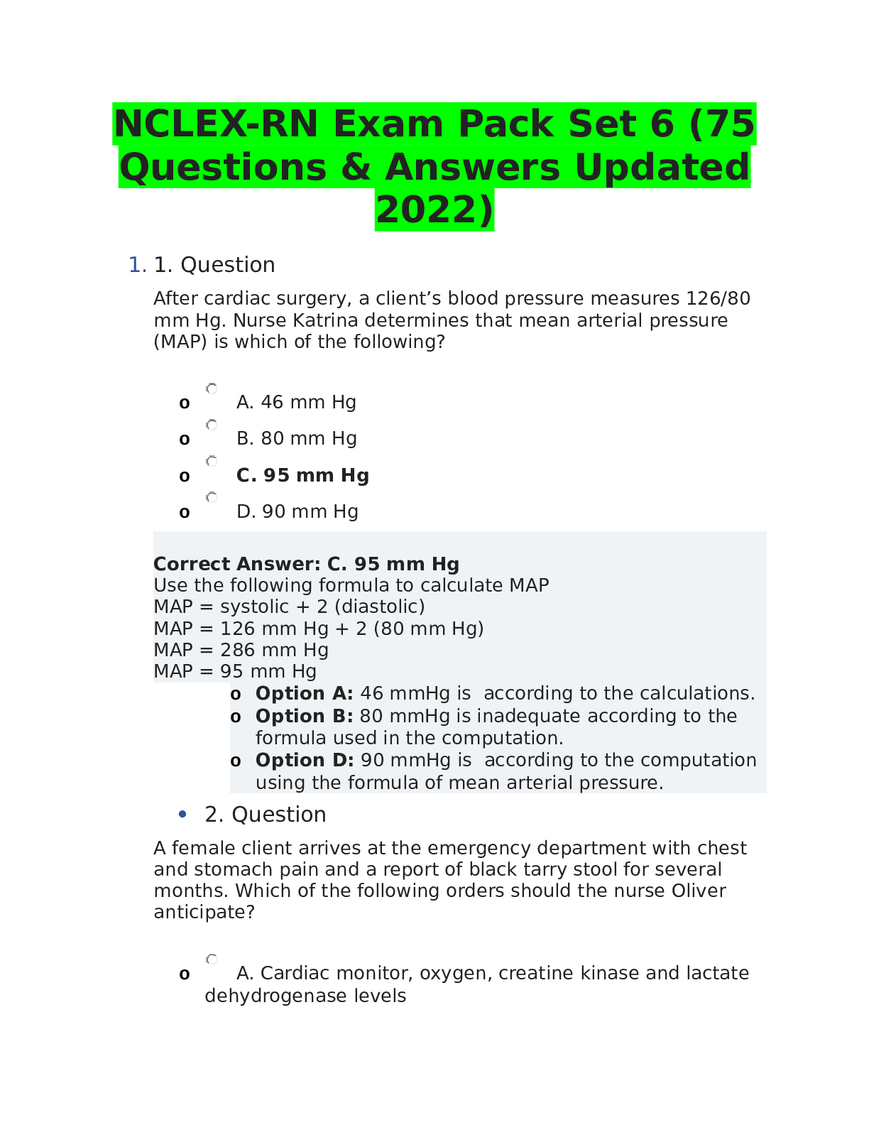 *NURSING > NCLEX-RN > NCLEX-RN Exam Pack Set 6 (75 Questions & Answers Updated 2022)