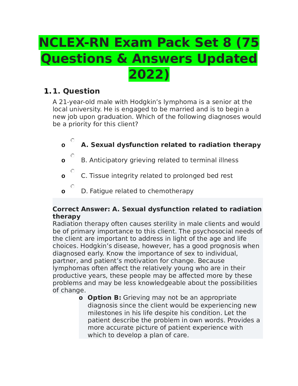 *NURSING > NCLEX-RN > NCLEX-RN Exam Pack Set 8 (75 Questions & Answers Updated 2022)