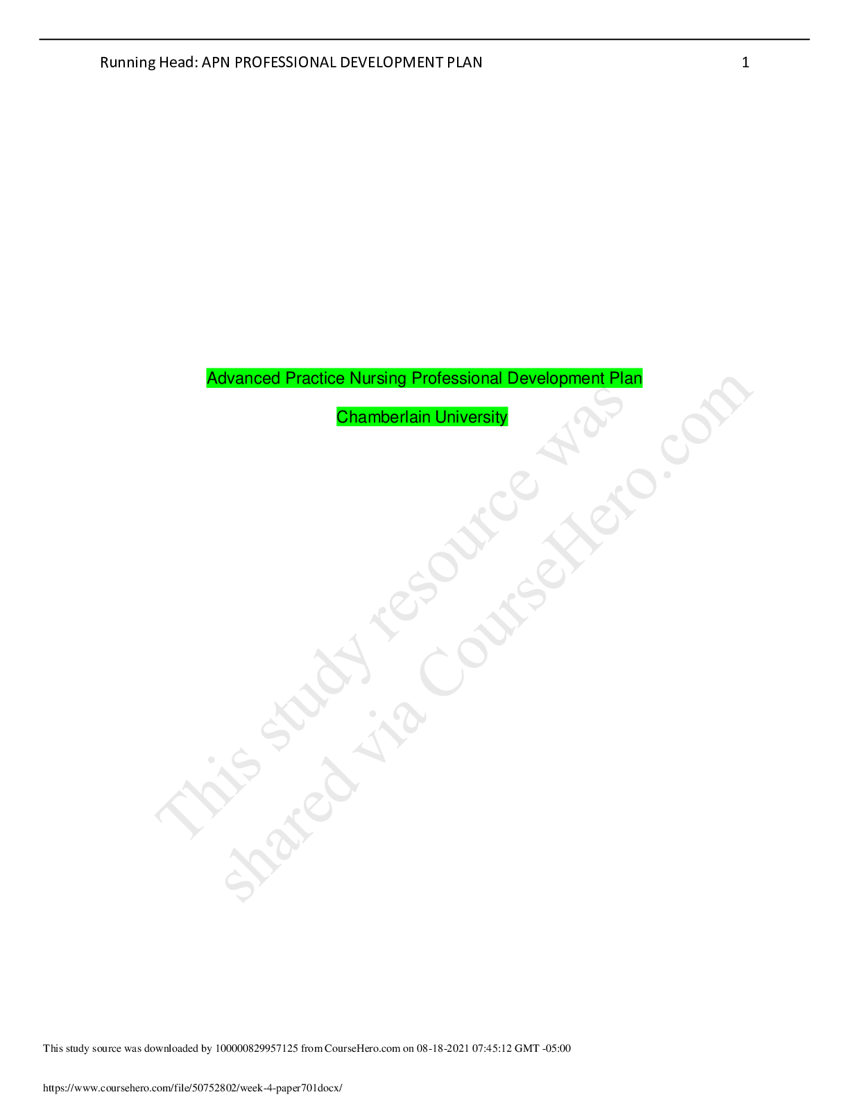 *NURSING > Research Paper > Chamberlain College of Nursing - NR 500 Week 4 Assignment: APN Professional Development Plan Paper_Already_Verified_