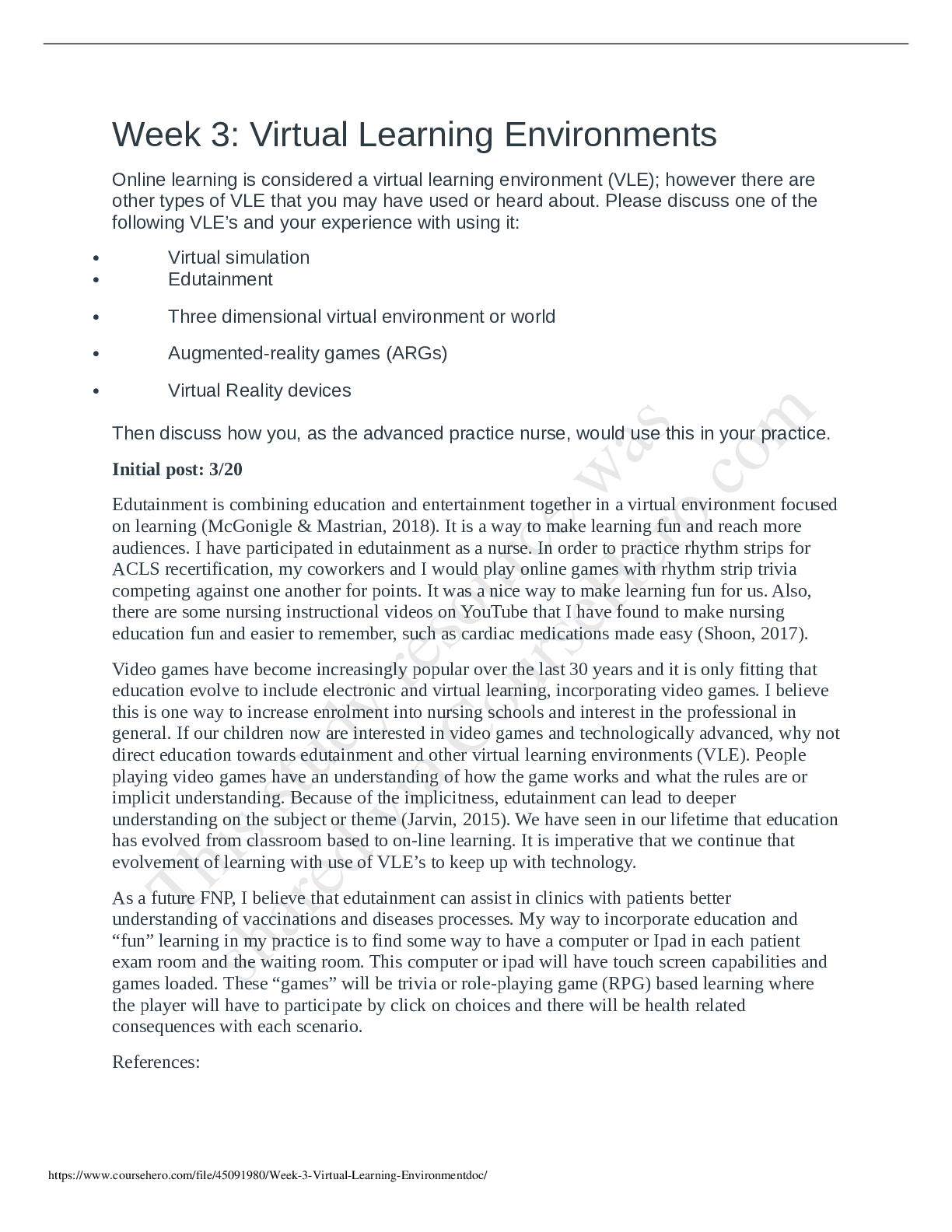 *NURSING > Research Paper > Chamberlain College of Nursing - NR 512 512Week 3 Virtual Learning Environment.