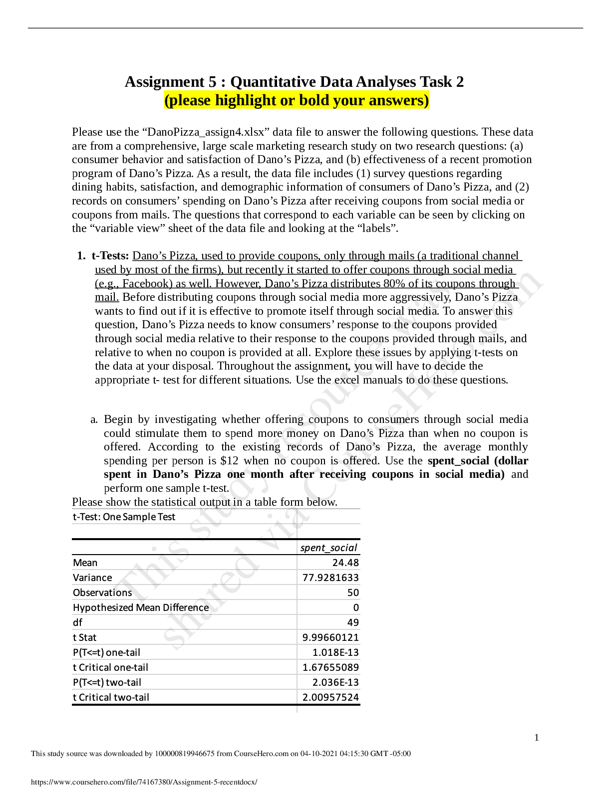 Marketing > Research Paper > University of South Carolina - MKTG 352Assignment 5 (recent) quantitative Data Analyses Task 2