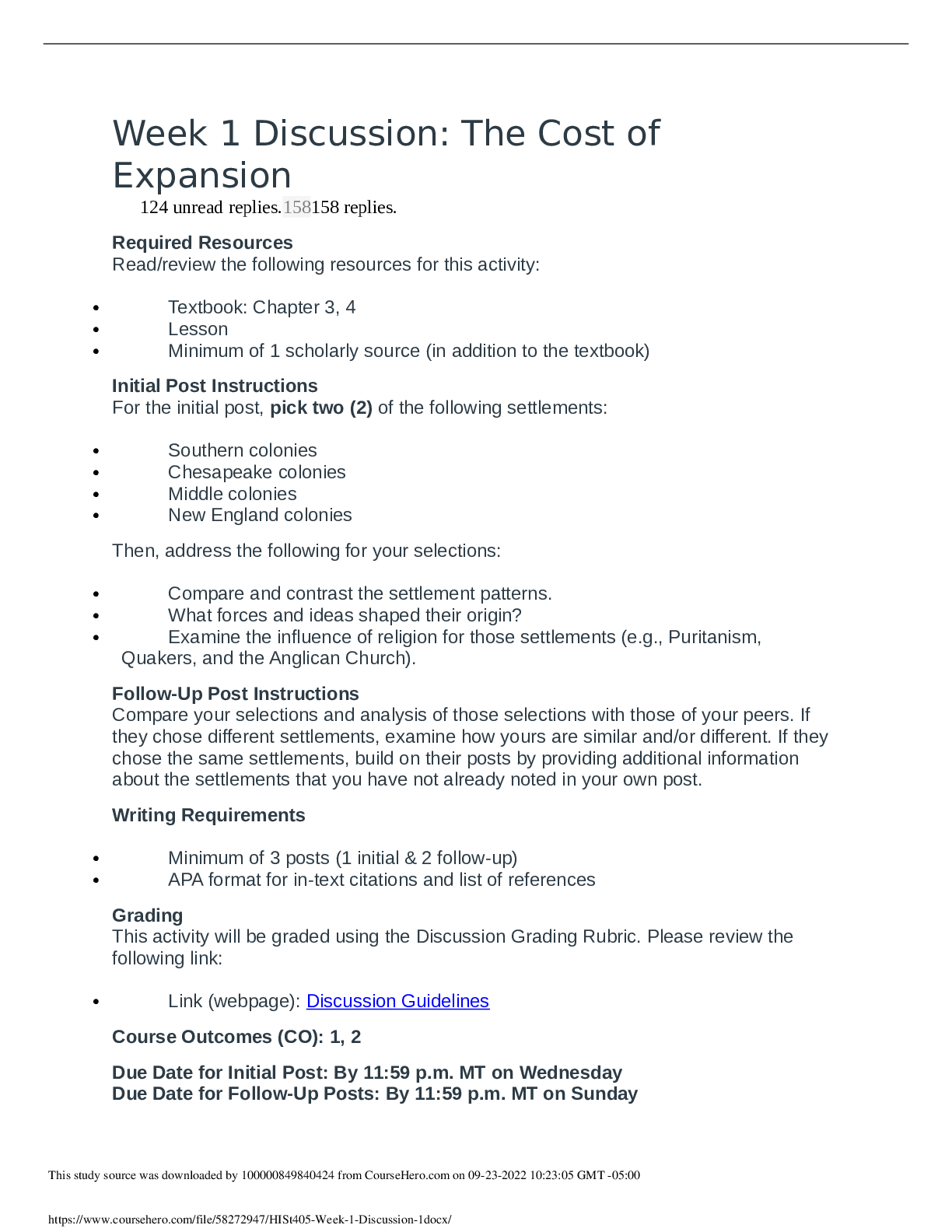 History > DISCUSSION POST > HIST-405N Week 1 Discussion: The Cost of Expansion: Southern Colonies and the Chesapeake Colonies