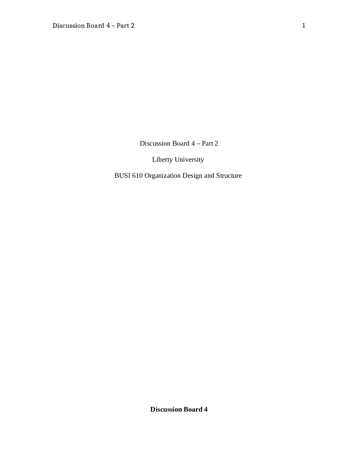 Business > DISCUSSION POST > Discussion Board 4 – Part 2 Liberty University BUSI 610 Organization Design and Structure