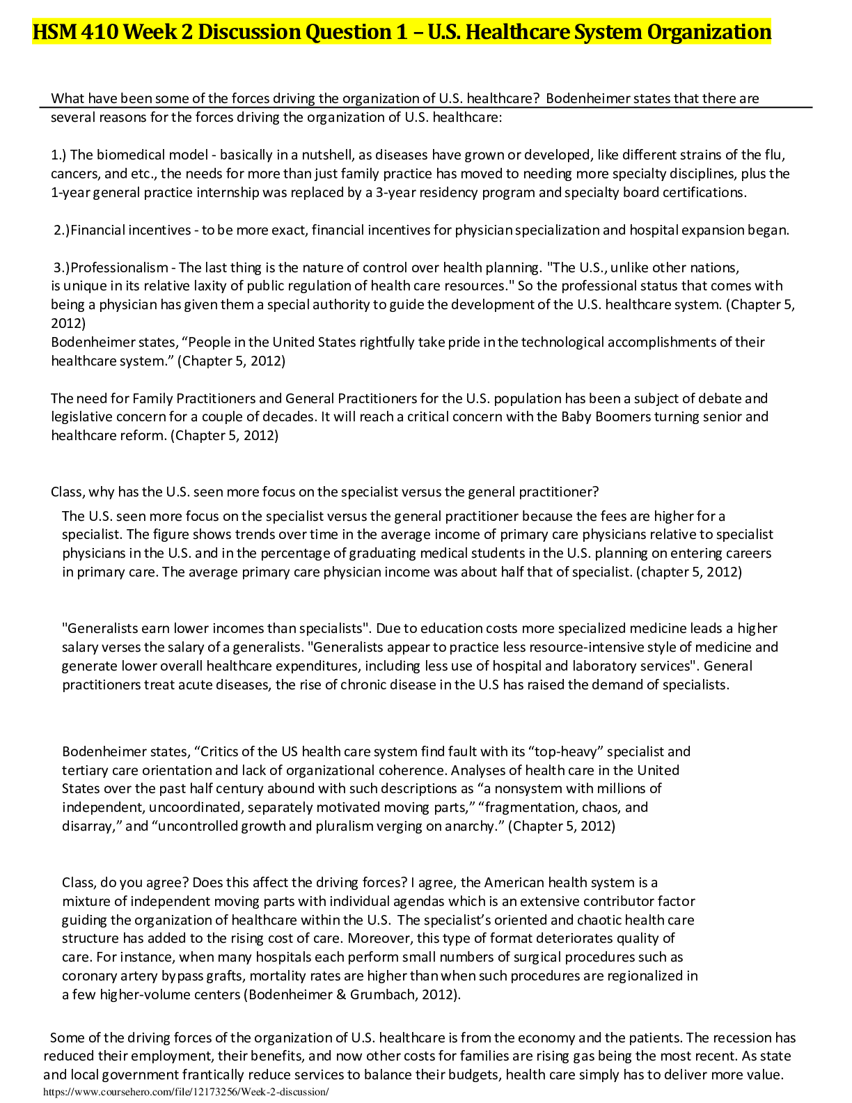 Health Care > DISCUSSION POST > HSM 410 Week 2 Discussion Question 1 – U.S. Healthcare System Organization (RATED A+)