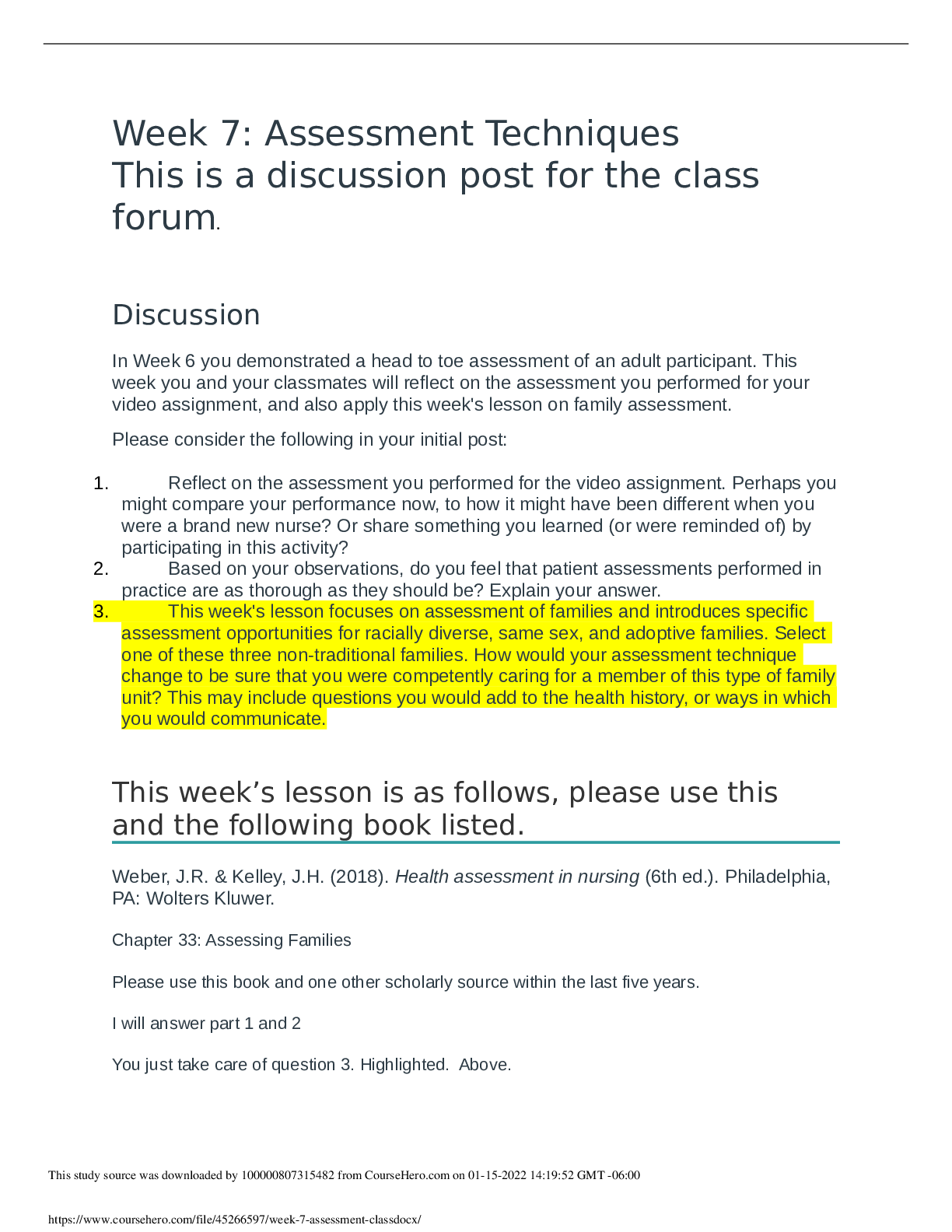 *NURSING > DISCUSSION POST > NR 305 Week 7 Discussion, Assessment Techniques