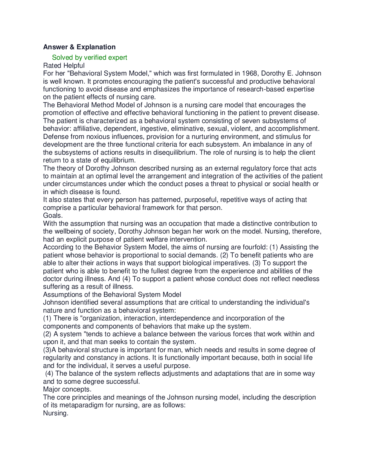 *NURSING > DISCUSSION POST > Nursing assignment Explain the importance of Dorothy Johnson's Behavioral System Model of practice in nursing. Explain how to apply this model in an advanced nursing practice roles.