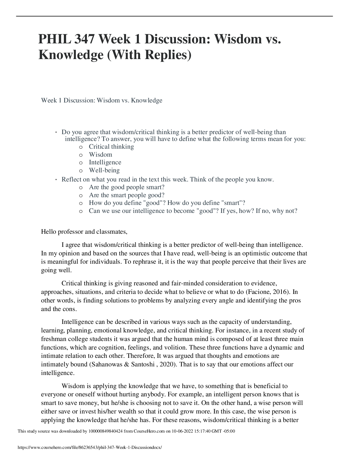 Critical Thinking > DISCUSSION POST > PHIL 347 Week 1 Discussion: Wisdom vs. Knowledge (With Replies) | GRADED A
