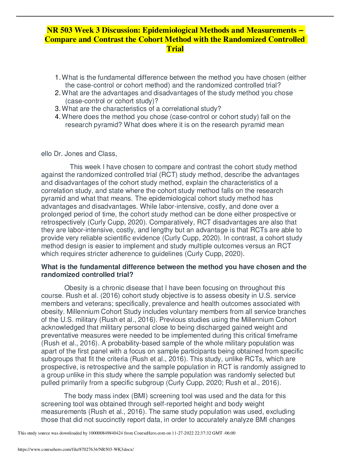 *NURSING > DISCUSSION POST > NR 503 Week 3 Discussion: Epidemiological Methods and Measurements – Compare and Contrast the Cohort Method with the Randomized Controlled Trial