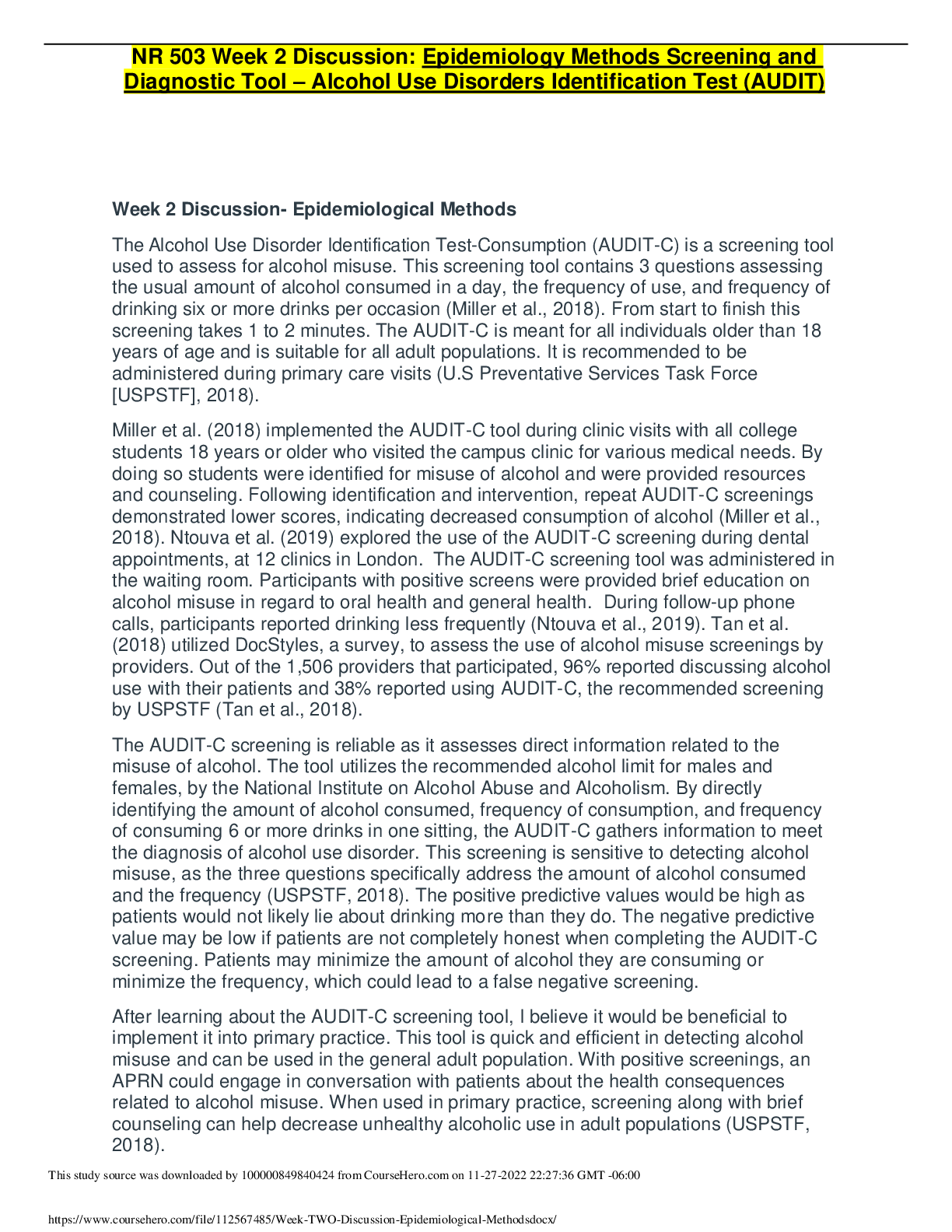 *NURSING > DISCUSSION POST > NR 503 Week 2 Discussion: Epidemiology Methods Screening and Diagnostic Tool – Alcohol Use Disorders Identification Test (AUDIT)