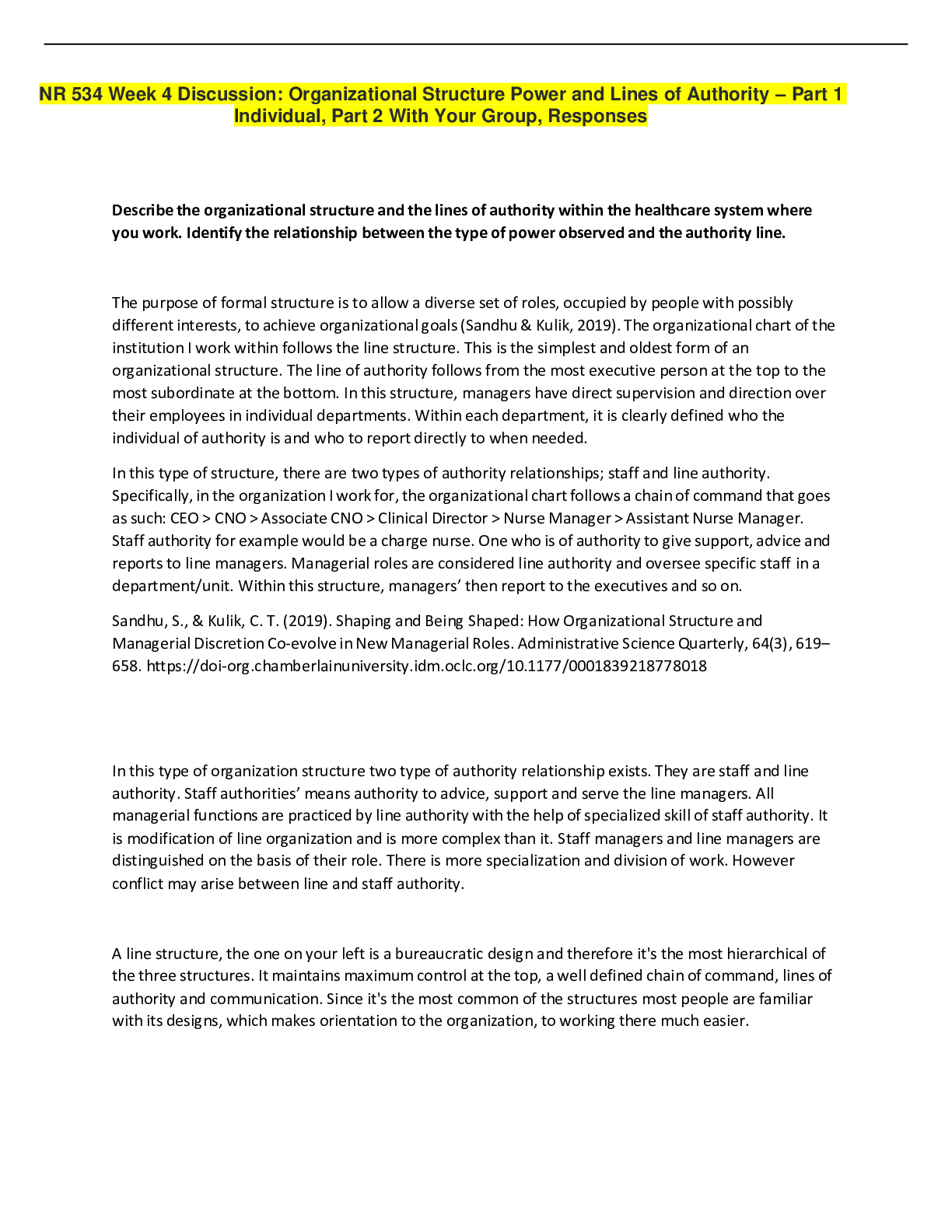 *NURSING > DISCUSSION POST > NR 534 Week 4 Discussion: Organizational Structure Power and Lines of Authority – Part 1: Individual, Part 2: With Your Group, Responses (GRADED A)