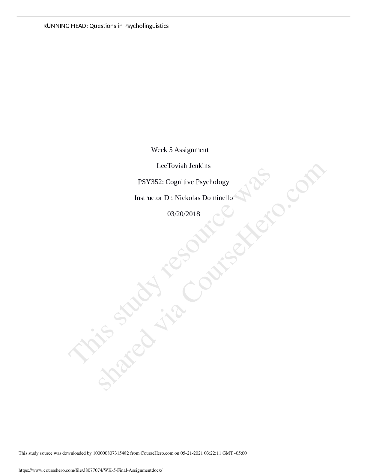 Psychology > DISCUSSION POST > PSY 352 Week 5 Final Paper, Questions in Psycholinguistics 2021