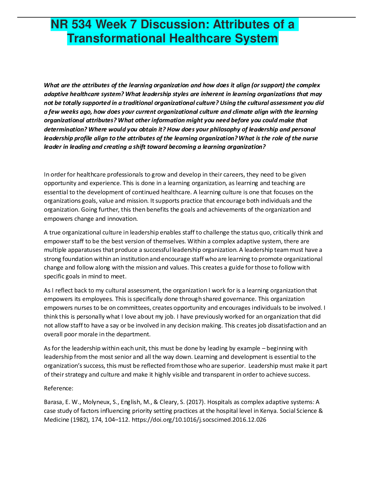 *NURSING > DISCUSSION POST > NR 534 Week 7 Discussion: Attributes of a Transformational Healthcare System | GRADED A+