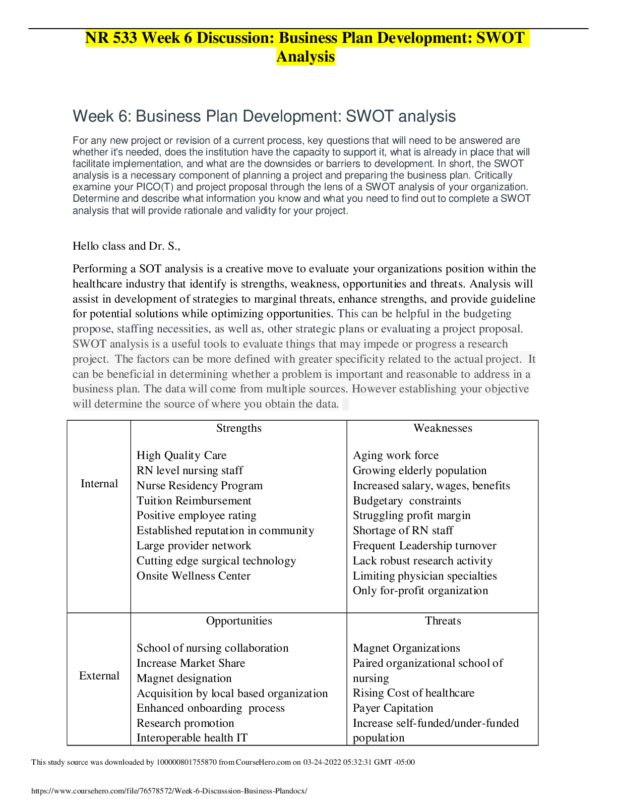 *NURSING > DISCUSSION POST > NR-533 Week 6 Discussion: Business Plan Development: SWOT Analysis (Version 2) | Download To Score An A