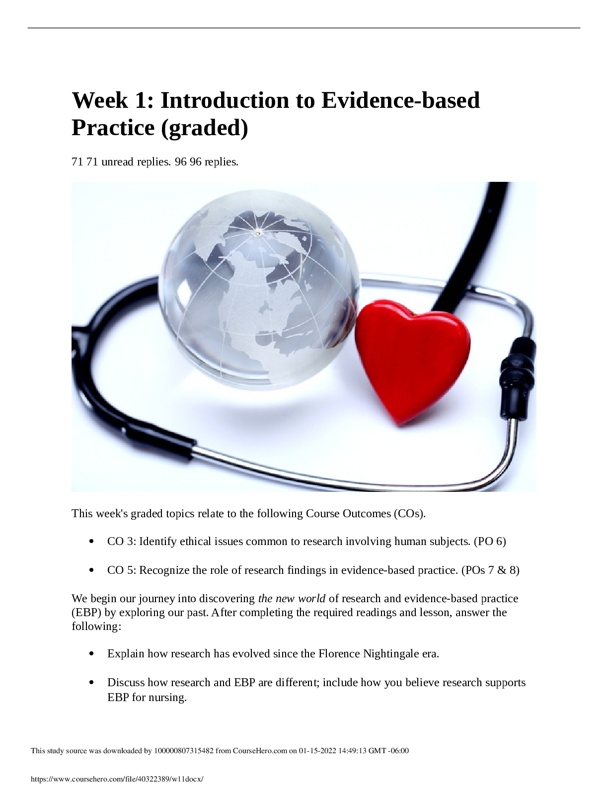 *NURSING > DISCUSSION POST > NR 439 Week 1 (Graded A) Discussion Topic: Introduction to Evidence-based Practice.