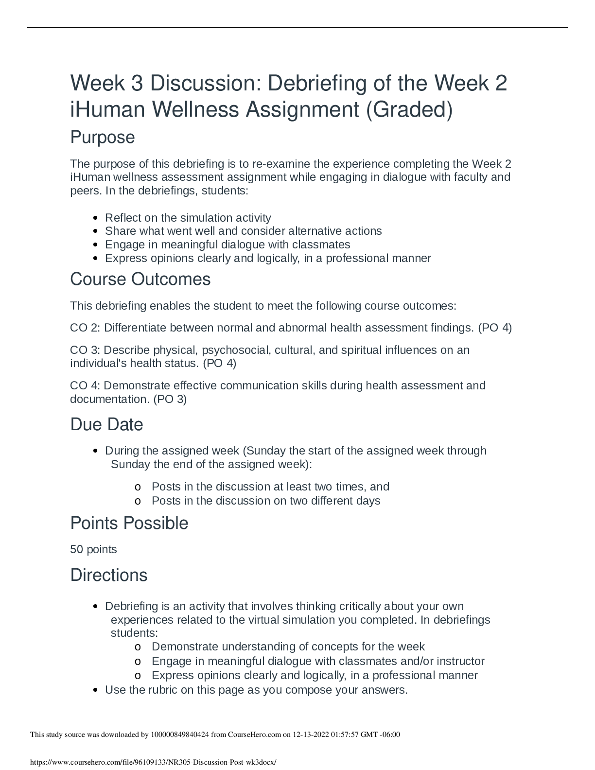 *NURSING > DISCUSSION POST > NR-305 Week 3 Discussion Question: Debriefing of the Week 2 iHuman Wellness Assignment (GRADED)