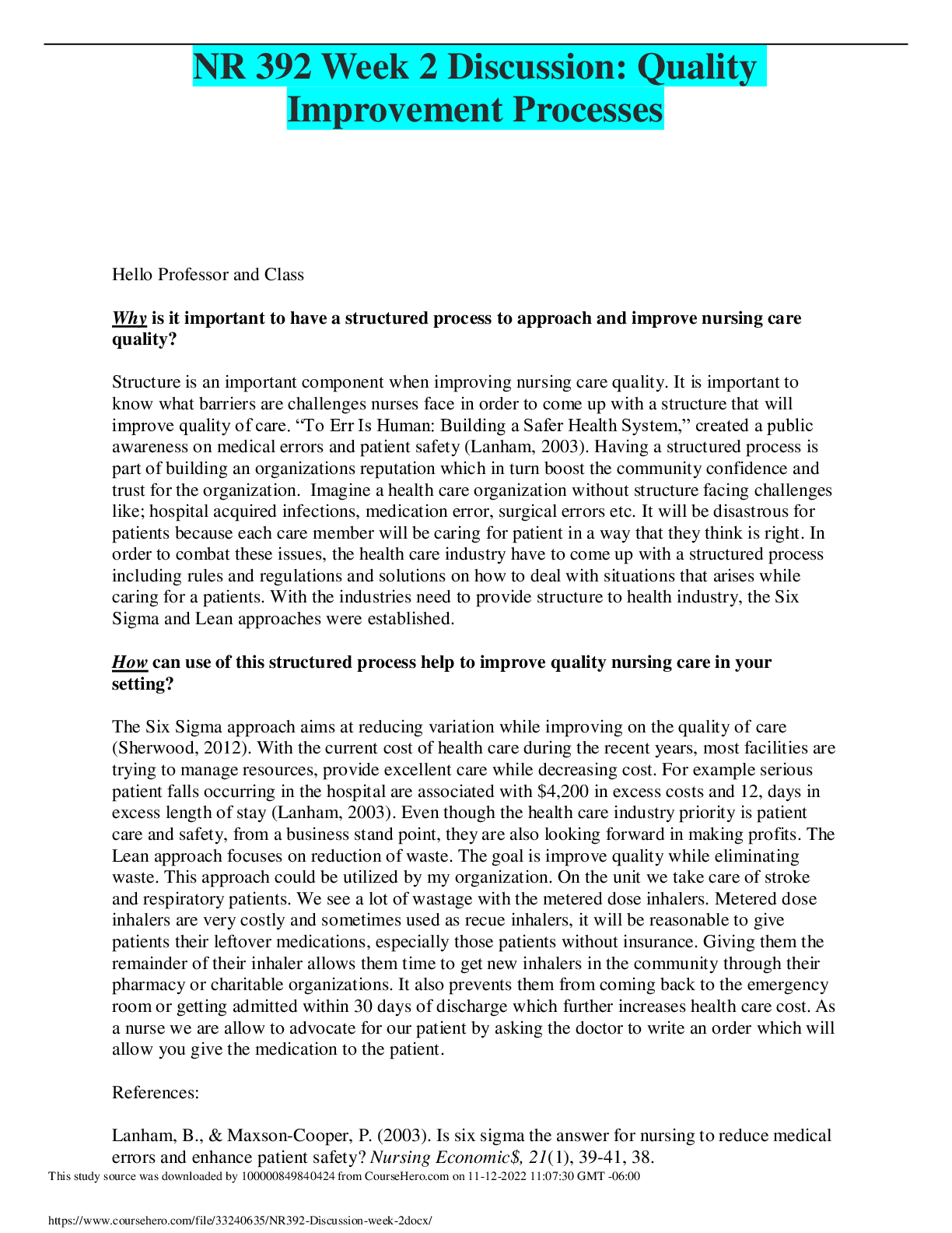 *NURSING > DISCUSSION POST > NR 392 Week 2 Discussion: Quality Improvement Processes(GRADED)
