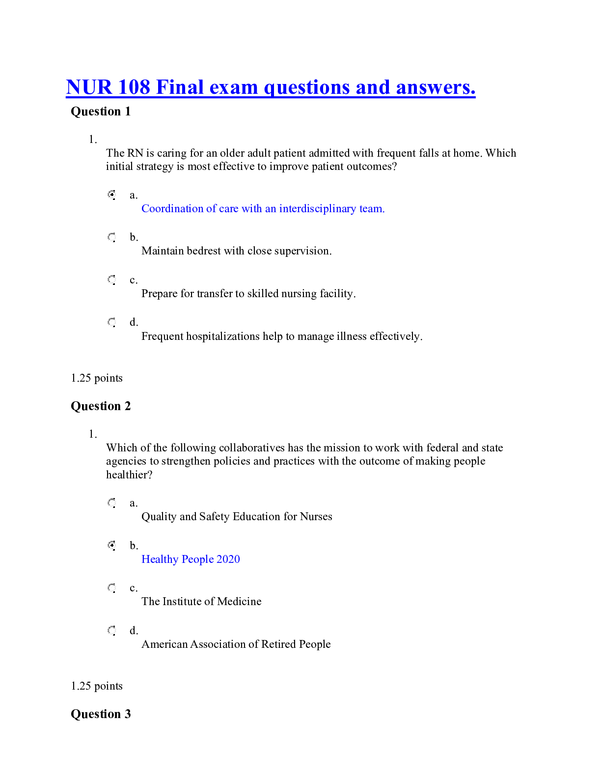 *NURSING > Final Exam Review > NUR 108 Final exam questions and answers.