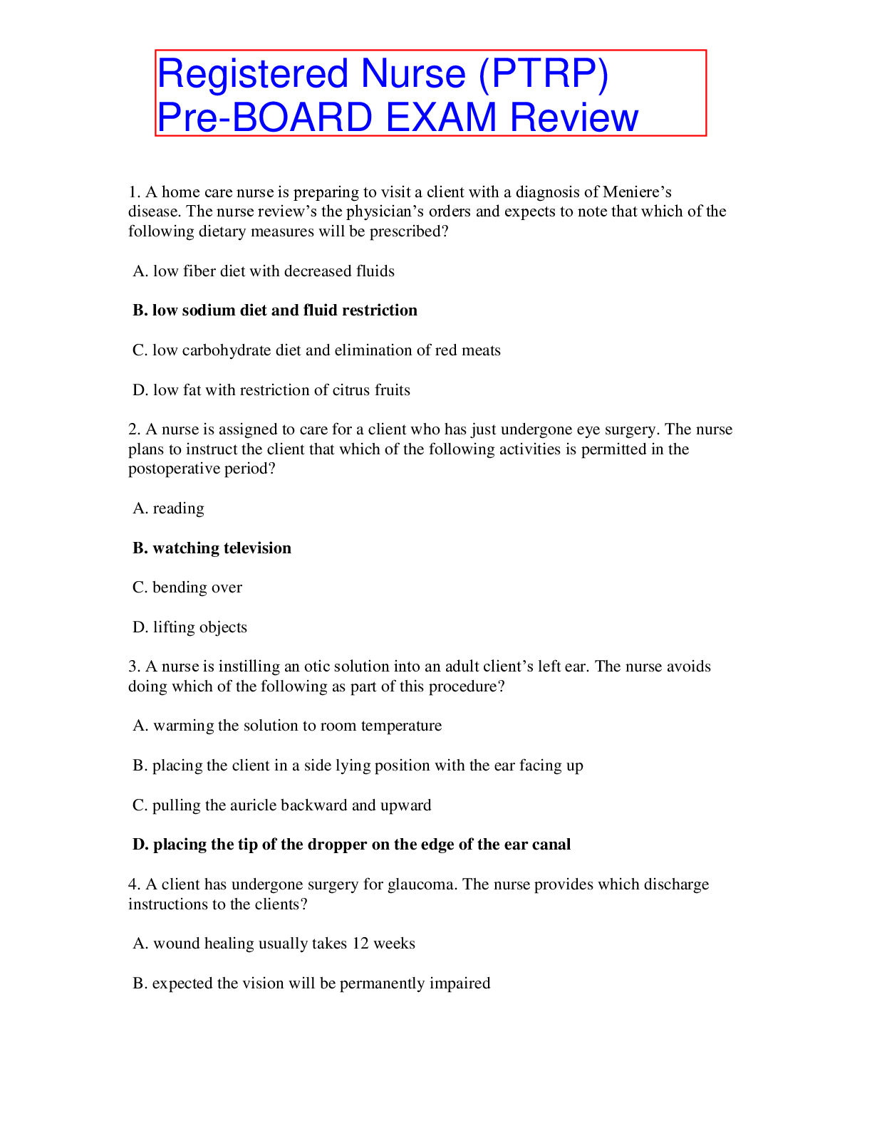 *NURSING > Final Exam Review > Registered Nurse (PTRP) Pre-BOARD EXAM Review. This document contain 400+ Questions and Answers. In four equal sections