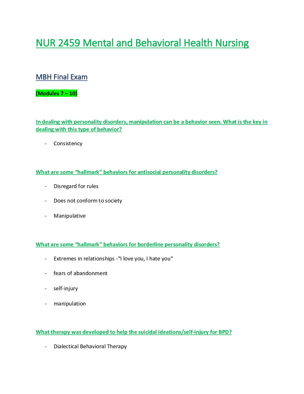 *NURSING > Final Exam Review > NUR2459 / NUR 2459: Final Exam (Latest Update) Mental and Behavioral Health Nursing - Rasmussen