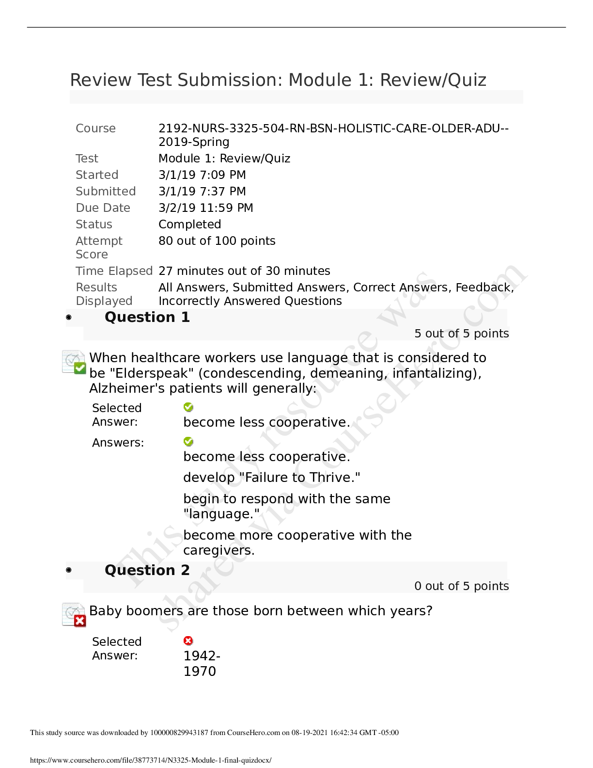 *NURSING > Final Exam Review > Chamberlain College of Nursing COMPLEX CR NR 341Gerontology quiz 1_answers