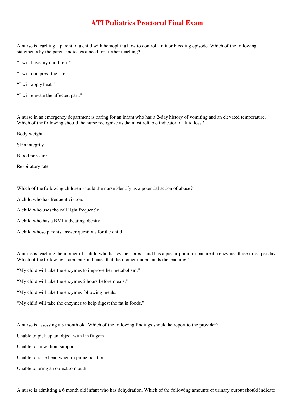 Health Care > Final Exam Review > ATI Pediatrics Proctored Final Exam Guide 2020/2021