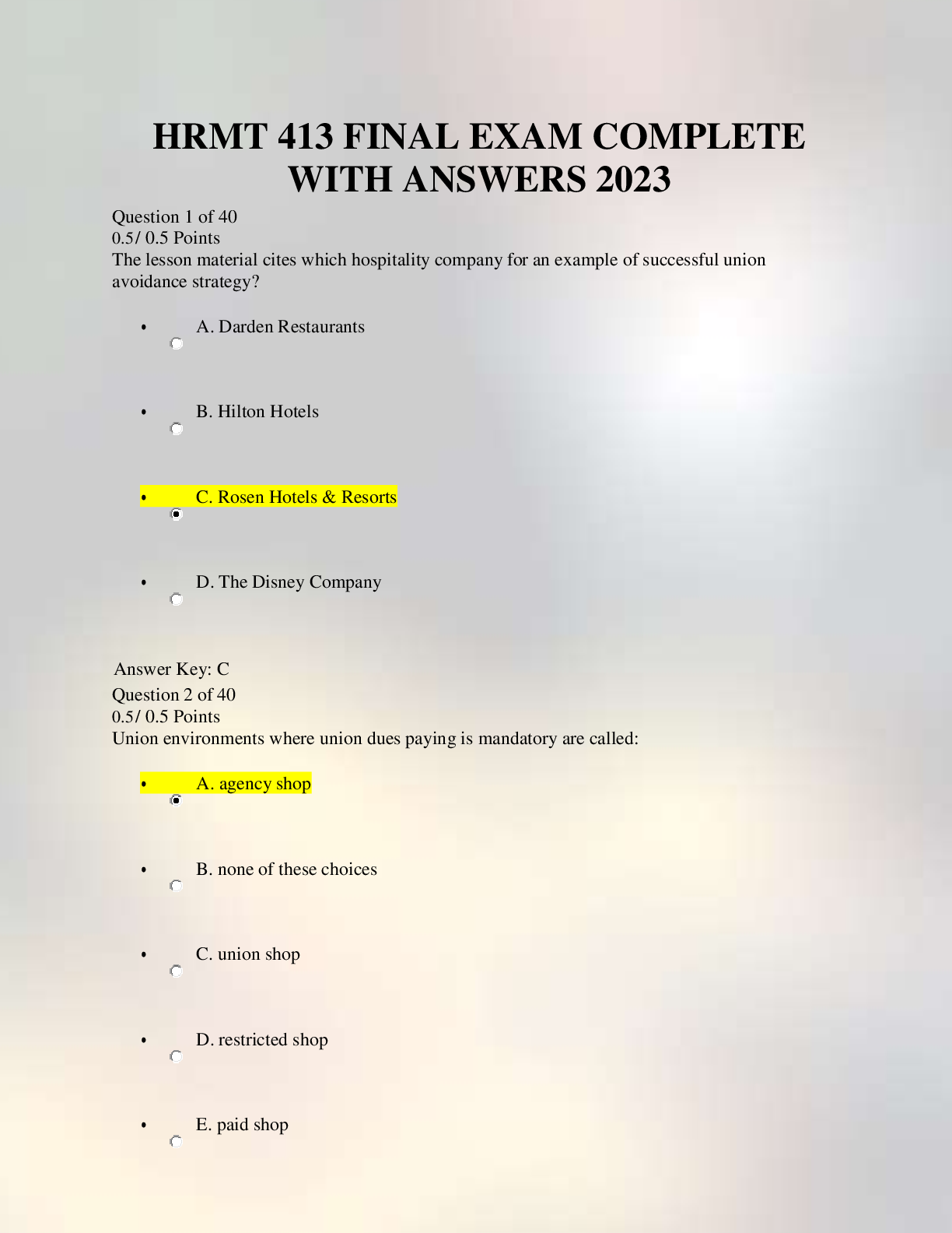 History > Final Exam Review > HRMT 413 FINAL EXAM COMPLETE WITH ANSWERS 2023