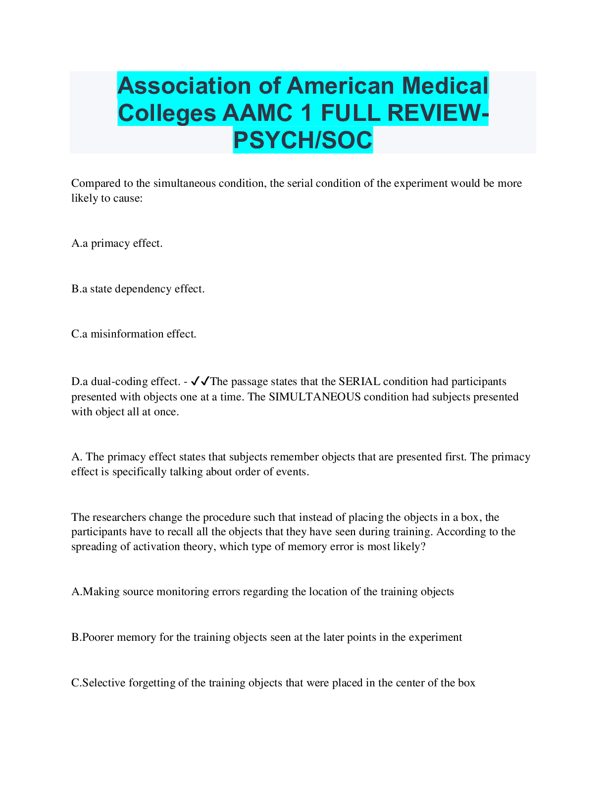 Psychology > EXAM REVIEW > Association of American Medical Colleges AAMC 1 FULL REVIEW- PSYCH/SOC