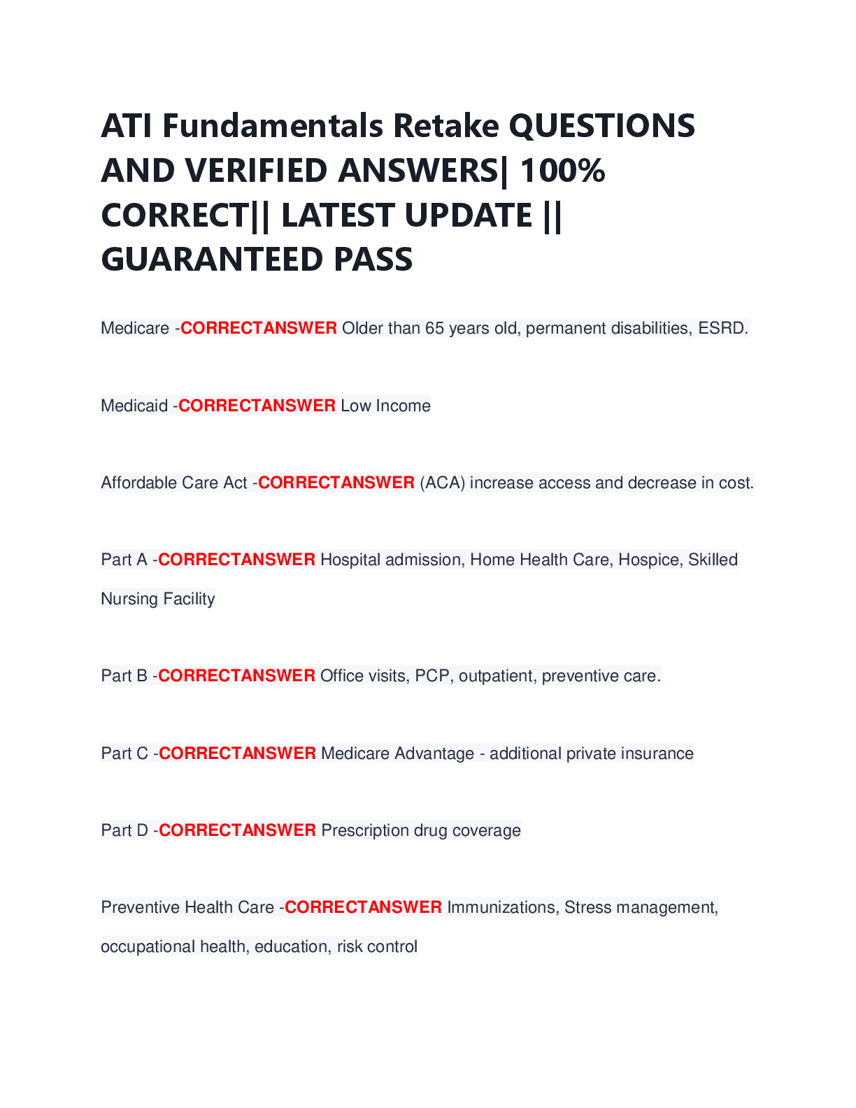 *NURSING > EXAM REVIEW > ATI Fundamentals Retake QUESTIONS AND VERIFIED ANSWERS| 100% CORRECT|| LATEST UPDATE || GUARANTEED PASS
