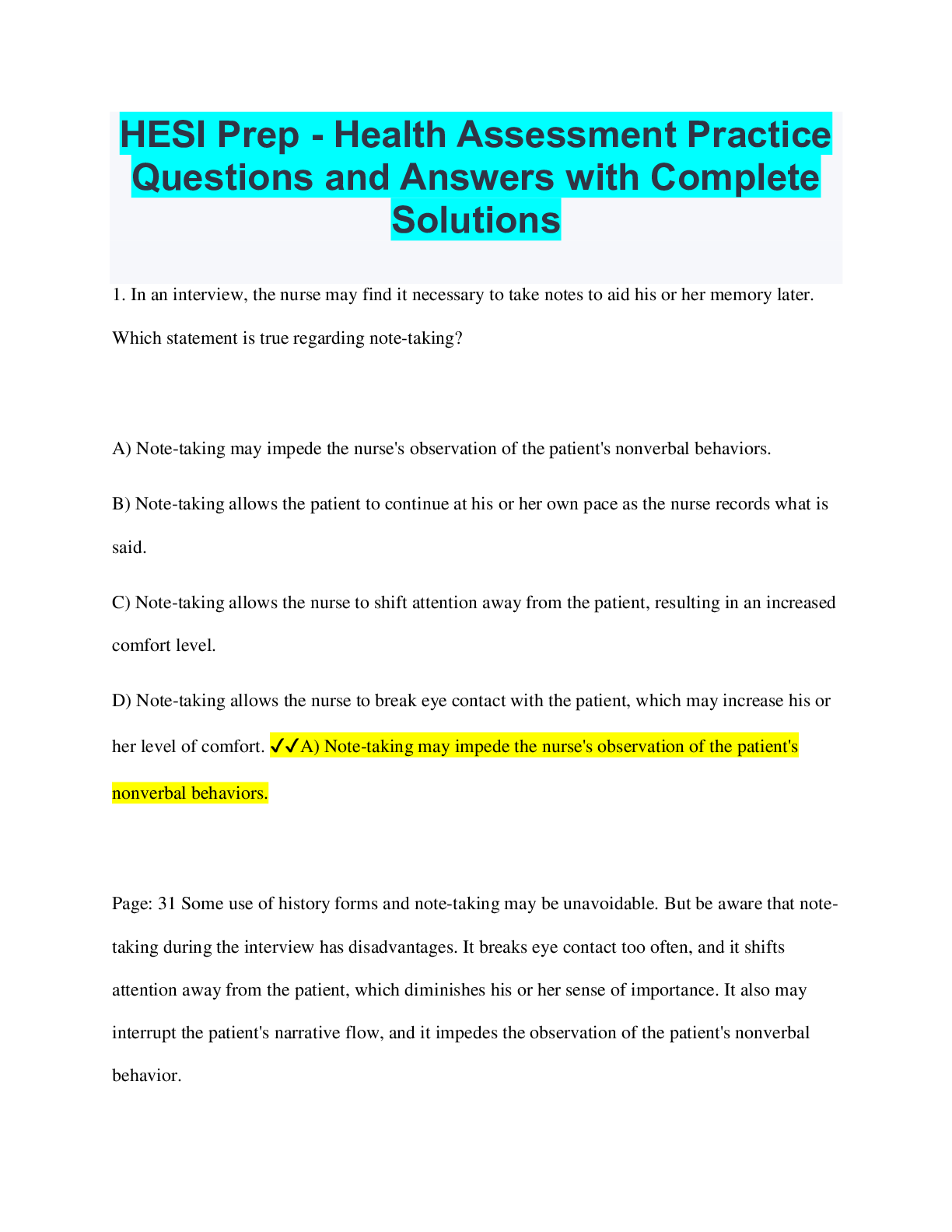Health CareEXAM REVIEW  > HESI Prep - Health Assessment Practice Questions and Answers with Complete Solutions