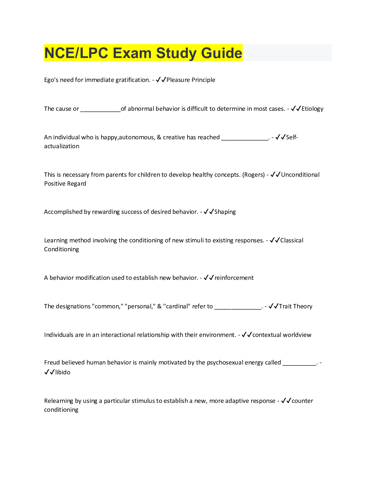 PsychologyEXAM REVIEW  > NCE/LPC Exam Study Guide(comlete 100% answers and solutions)