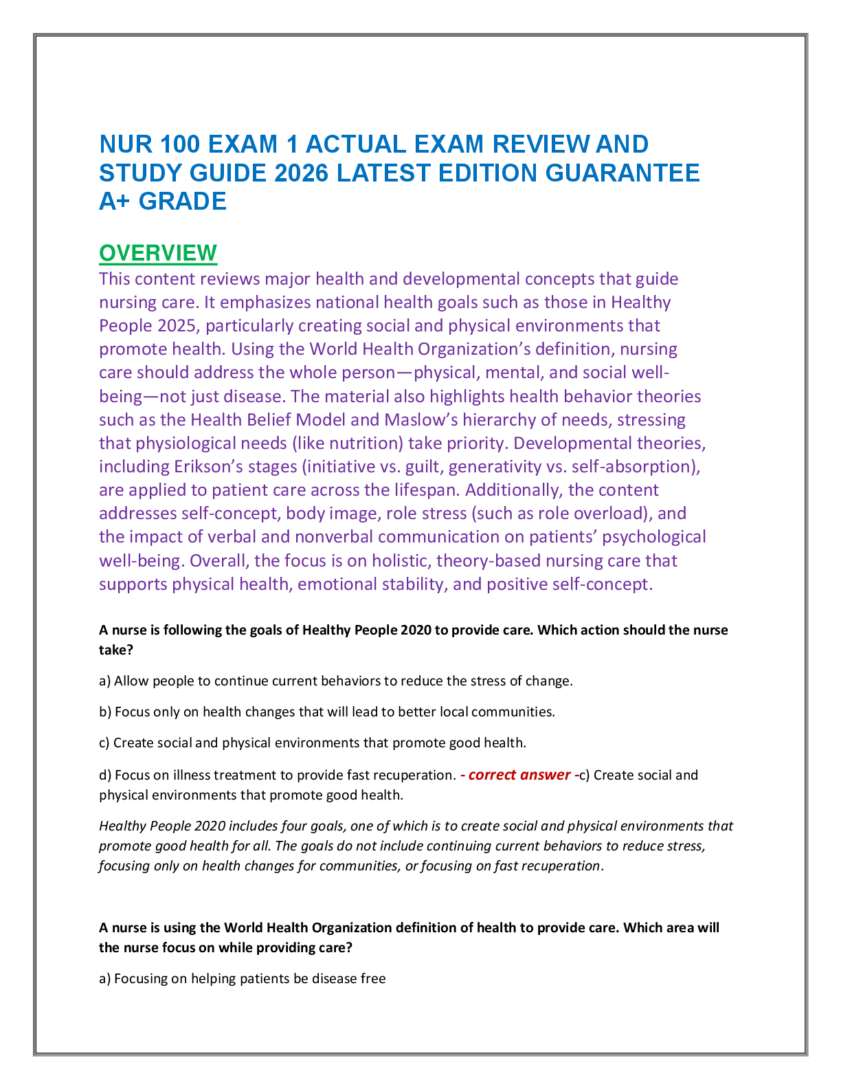 *NURSING > EXAM REVIEW > NUR 100 EXAM 1 ACTUAL EXAM REVIEW AND STUDY GUIDE 2026 LATEST EDITION GUARANTEE A+ GRADE