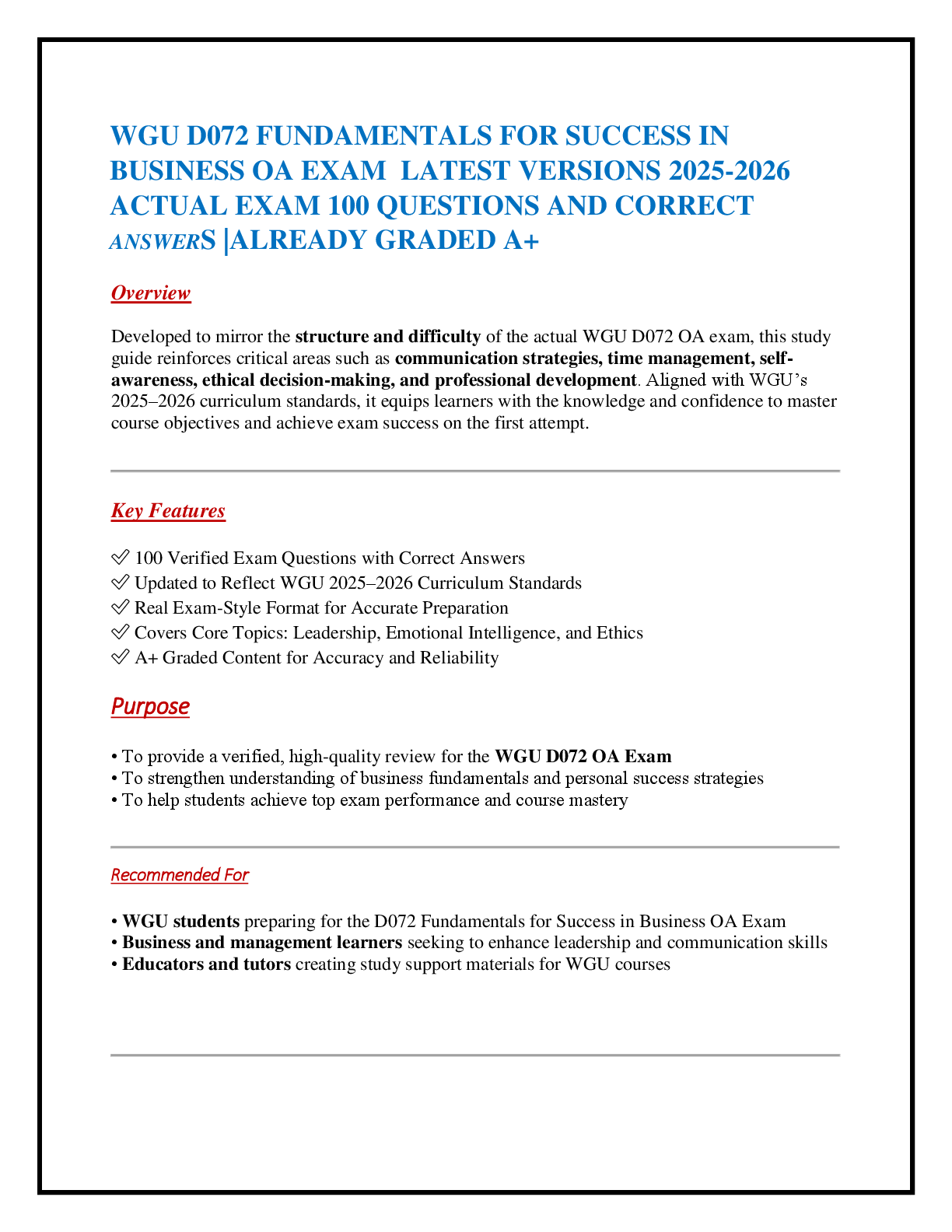> WGU D072 FUNDAMENTALS FOR SUCCESS IN BUSINESS OA EXAM LATEST VERSIONS 2025-2026 ACTUAL EXAM 100 QUESTIONS AND CORRECT ANSWERS |ALREADY GRADED A+