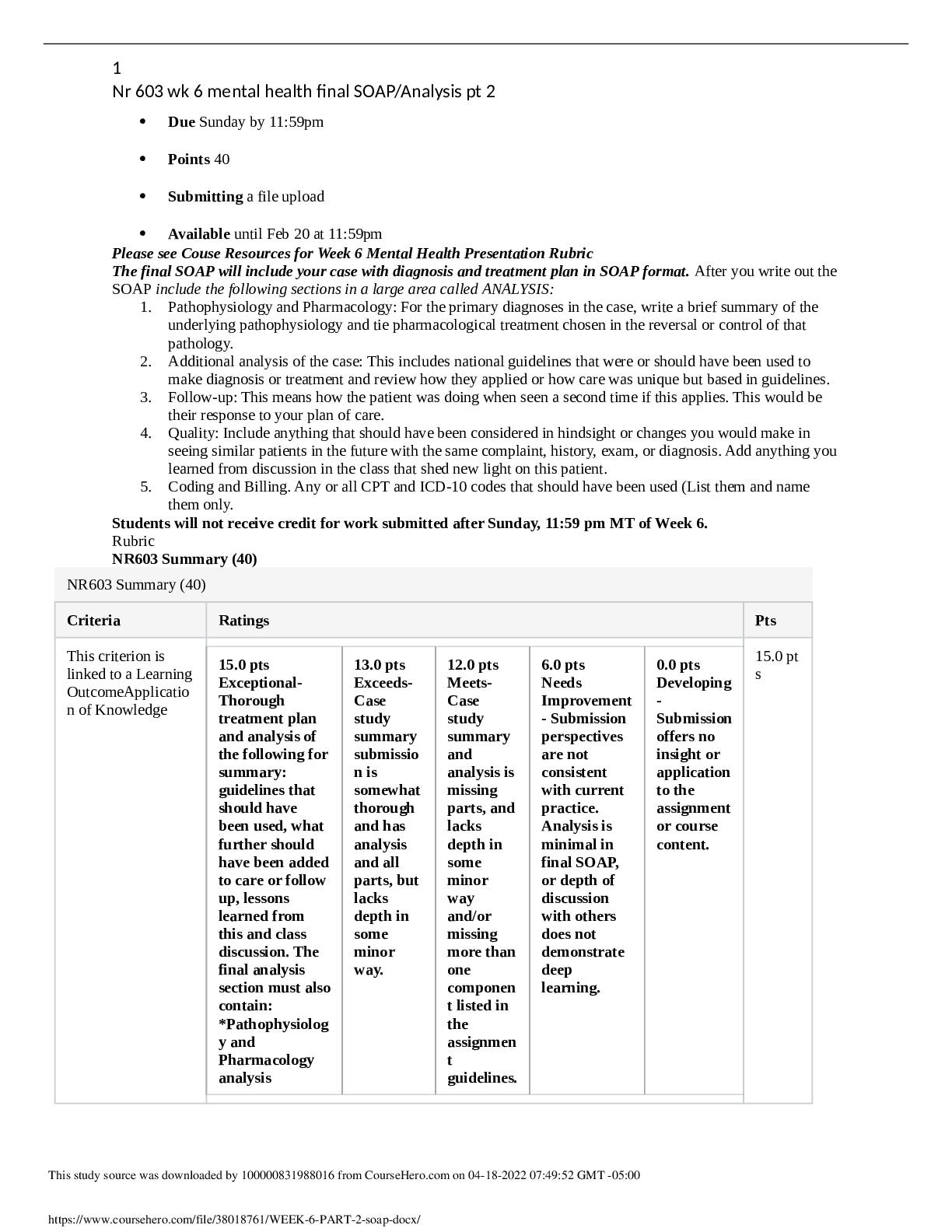 *NURSING > SOAP NOTE > NR 603 Week 6 Mental Health Final Treatment Plan/Analysis – Part 2-Chamberlain College Of Nursing:( SATISFACTION GUARANTEED, RATED A )