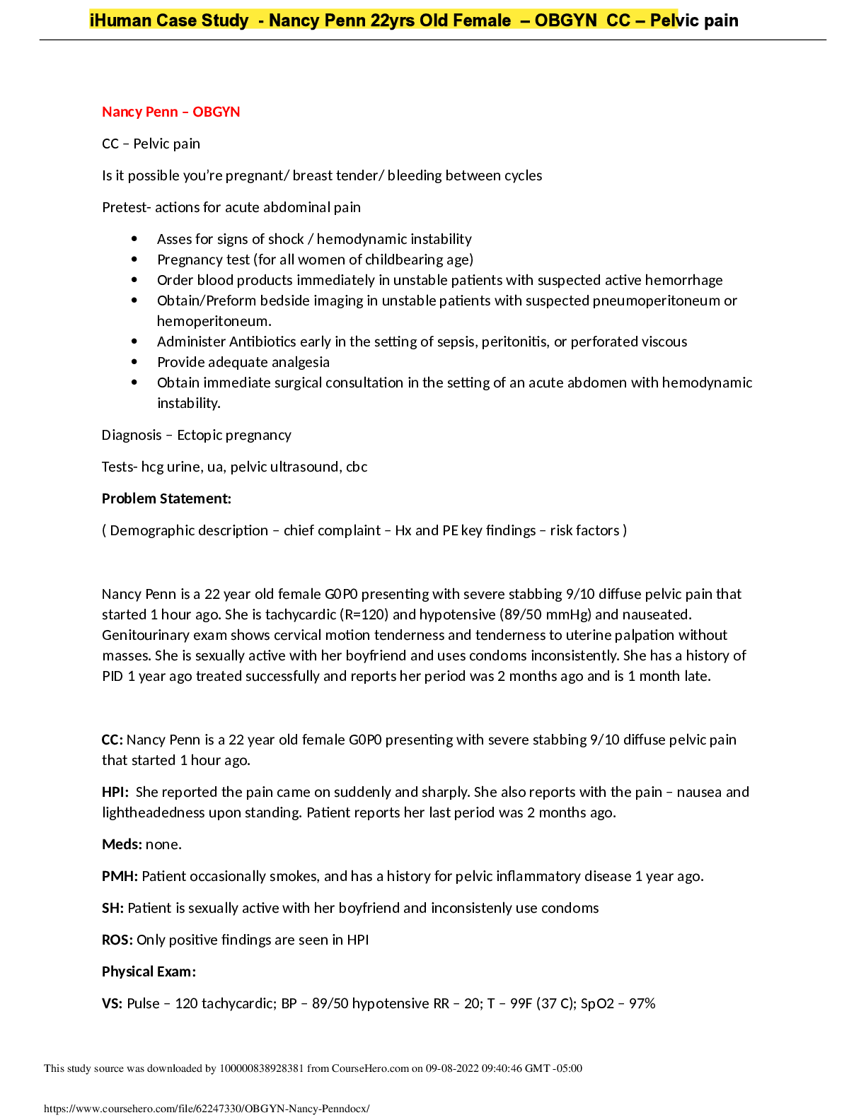 Health Care > iHuman Case Studies > Case Study i-human OBGYN Nancy Penn. - Complete Solutions (Graded A+)