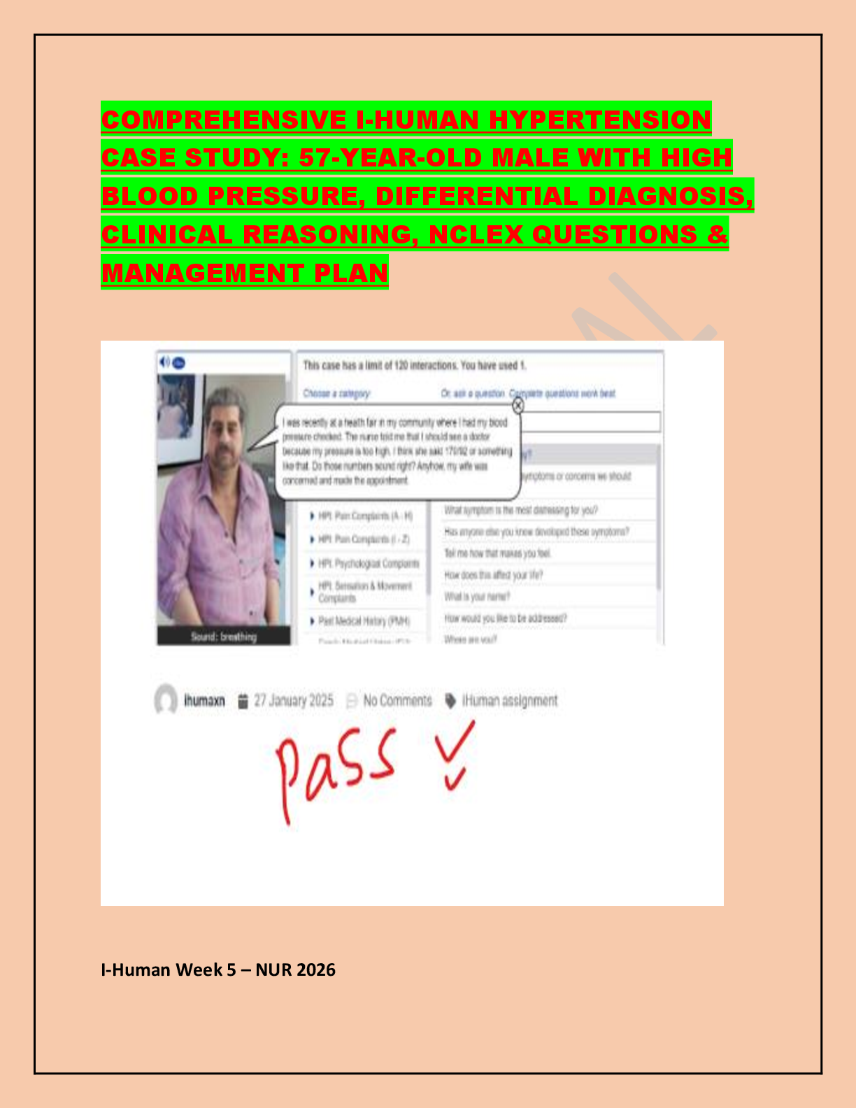 *NURSING > iHuman Case Studies > COMPREHENSIVE I-HUMAN HYPERTENSION CASE STUDY: 57-YEAR-OLD MALE WITH HIGH BLOOD PRESSURE, DIFFERENTIAL DIAGNOSIS, CLINICAL REASONING, NCLEX QUESTIONS & MANAGEMENT PLAN