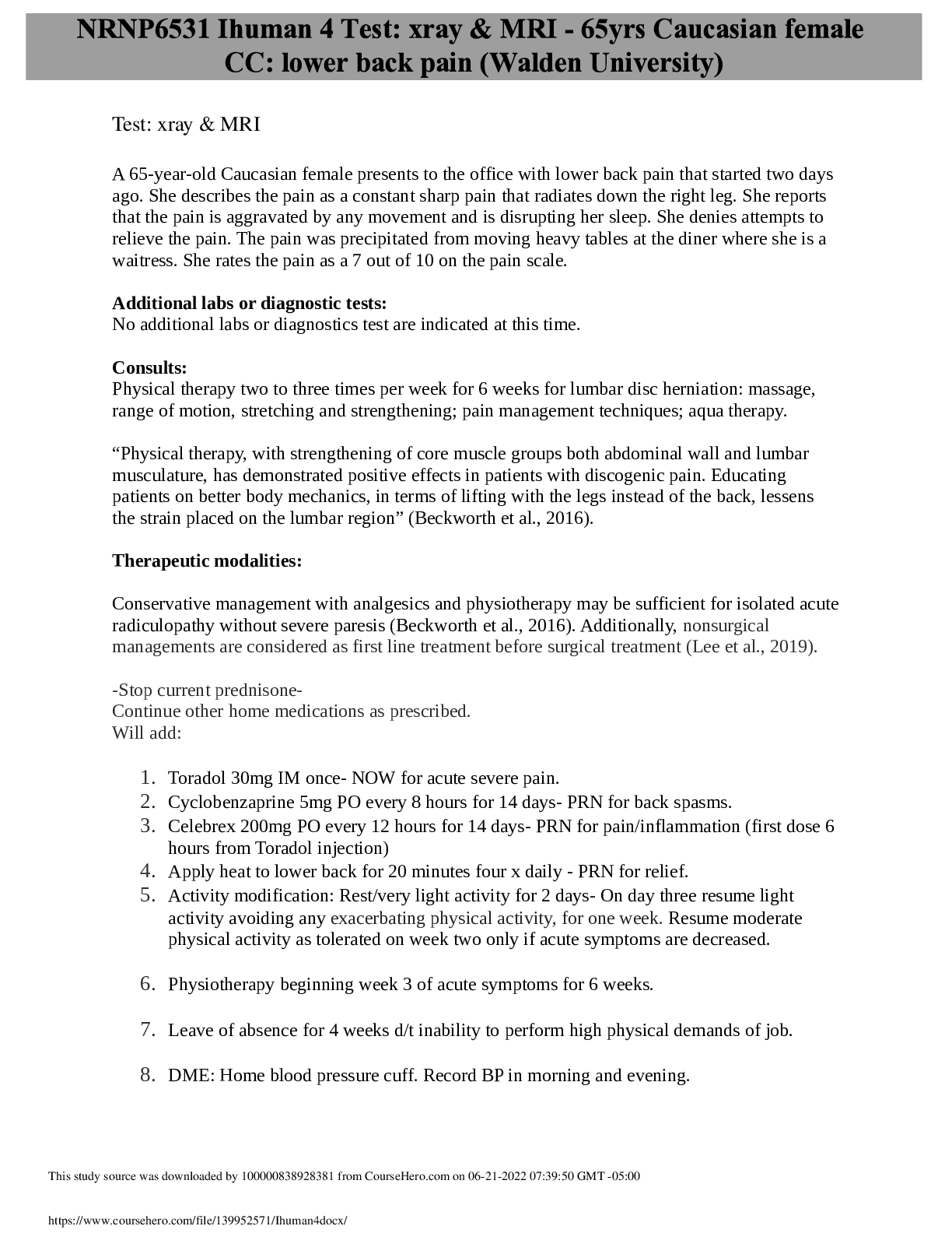 *NURSING > iHuman Case Studies > NRNP6531 Ihuman 4 Test: xray & MRI - 65yrs Caucasian female CC: lower back pain (Walden University)