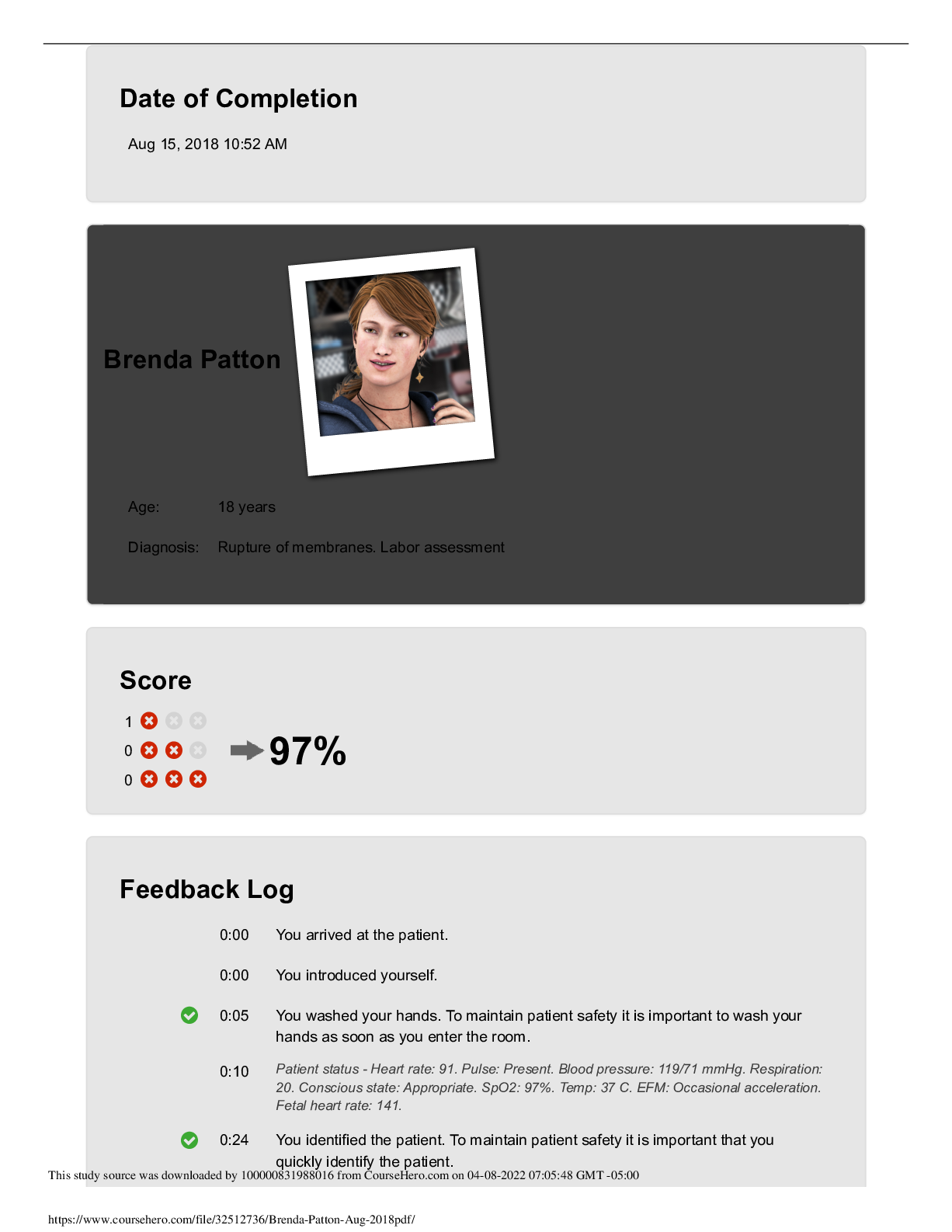 *NURSING > SHADOW HEALTH > Brenda Patton Age: 18 years Diagnosis: Rupture of membranes. Labor assessment (complete; scored 100%)