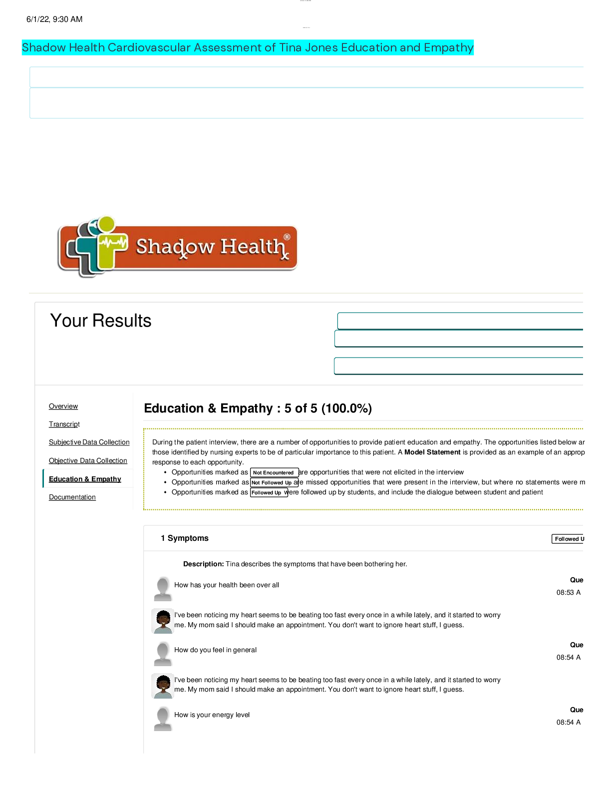 *NURSING > SHADOW HEALTH > Shadow Health Cardiovascular Assessment of Tina Jones Education and Empathy