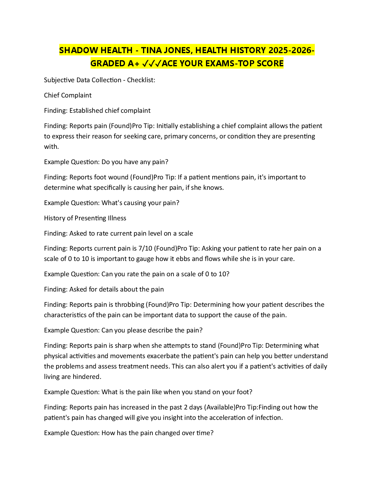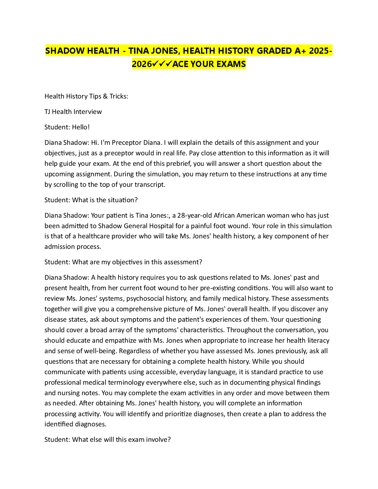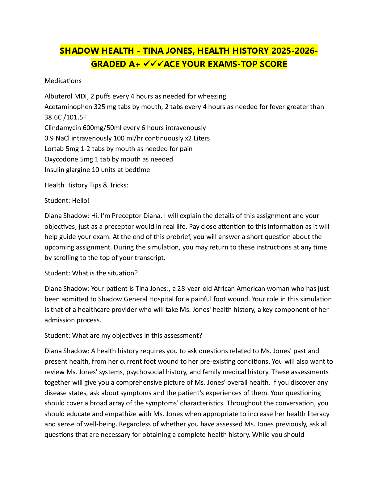 *NURSING > SHADOW HEALTH > SHADOW HEALTH - TINA JONES, HEALTH HISTORY GRADED A+ 2025 2026✓✓✓ACE YOUR EXAMS