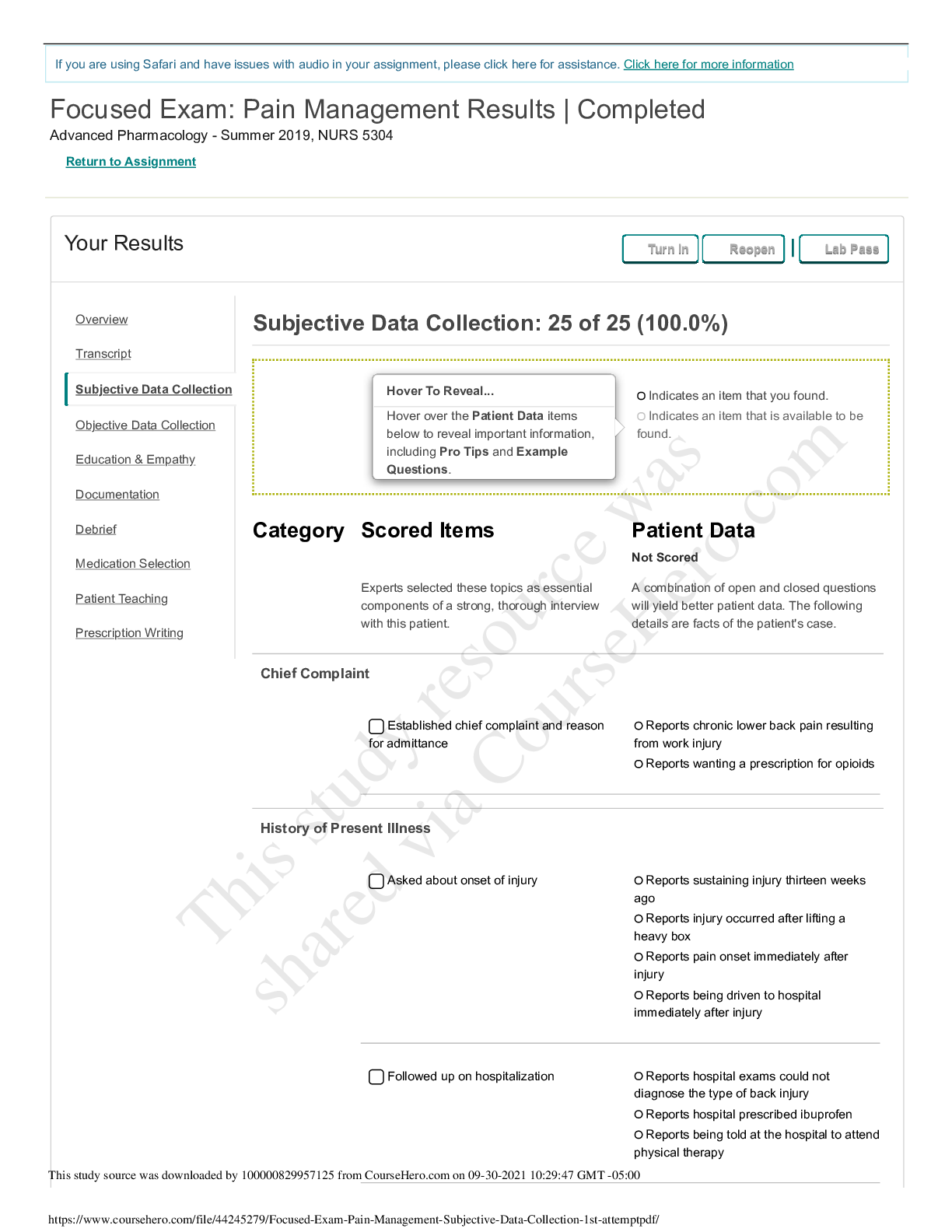 *NURSING > SHADOW HEALTH > (GRADED) Focused Exam_ Pain Management _ Subjective Data Collection 1st attempt. Analgesic, Codeine, Reports injury. 25 OUT OF 25 (100.0%)