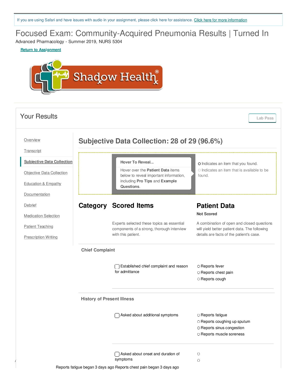 Health Care > SHADOW HEALTH > Shadow Health Focused Exam: Community-Acquired Pneumonia Results (Summer 2020) Subjective Data Collection: 28 of 29 (96.6%)