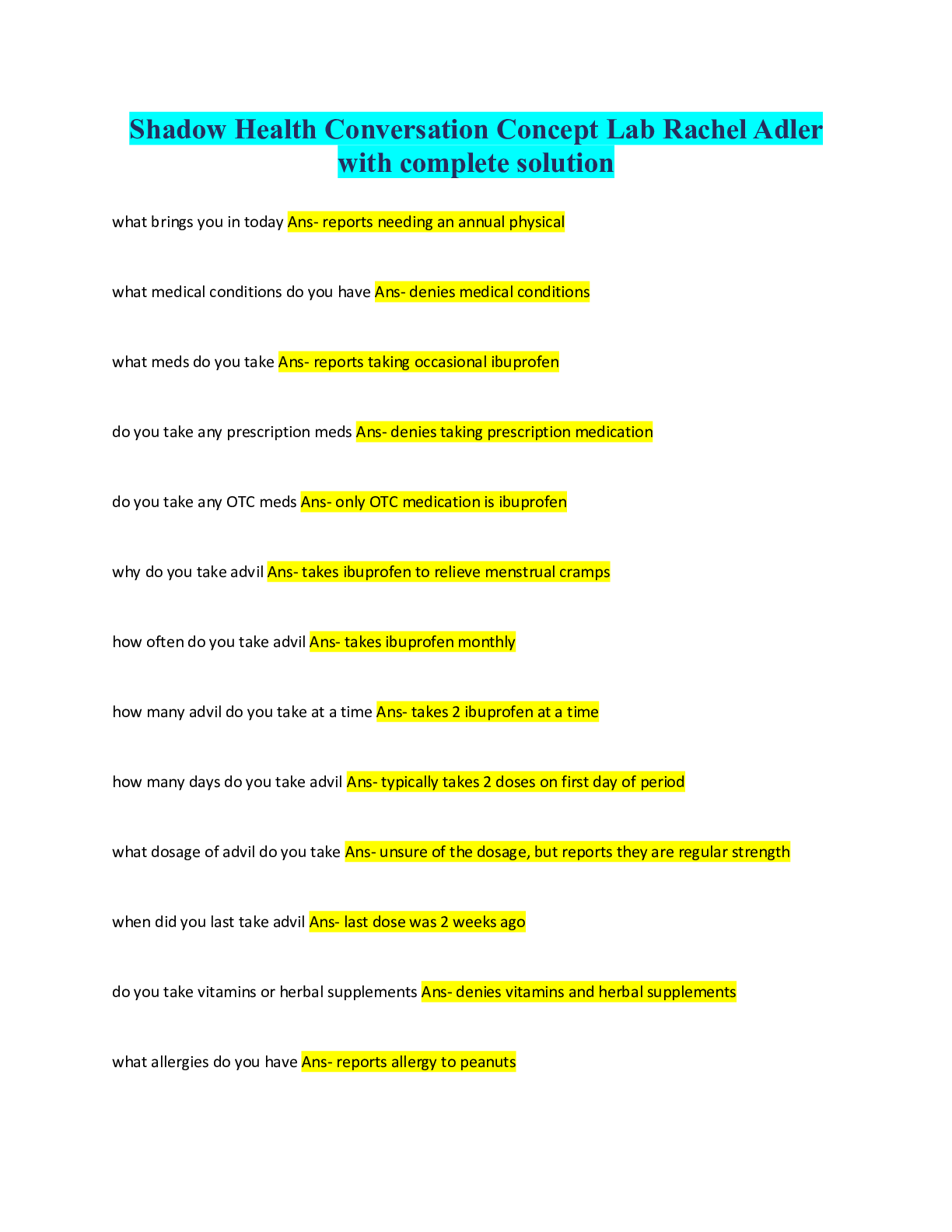 *NURSING > SHADOW HEALTH > Shadow Health Conversation Concept Lab Rachel Adler with complete solution